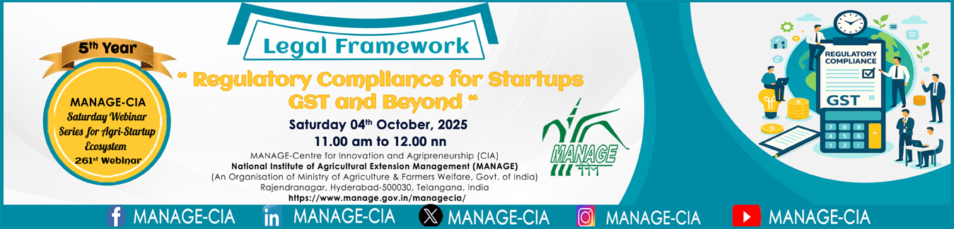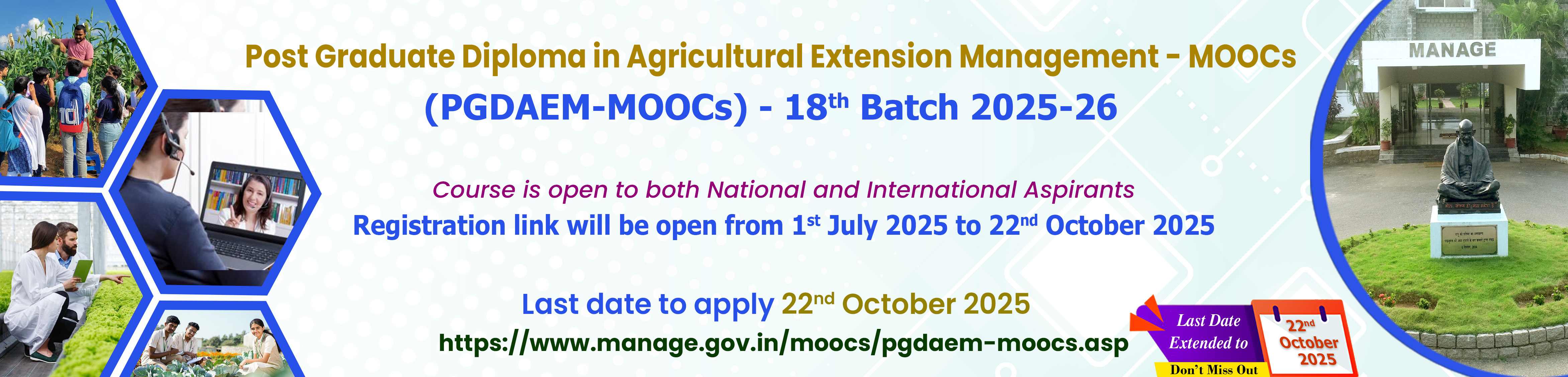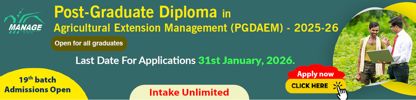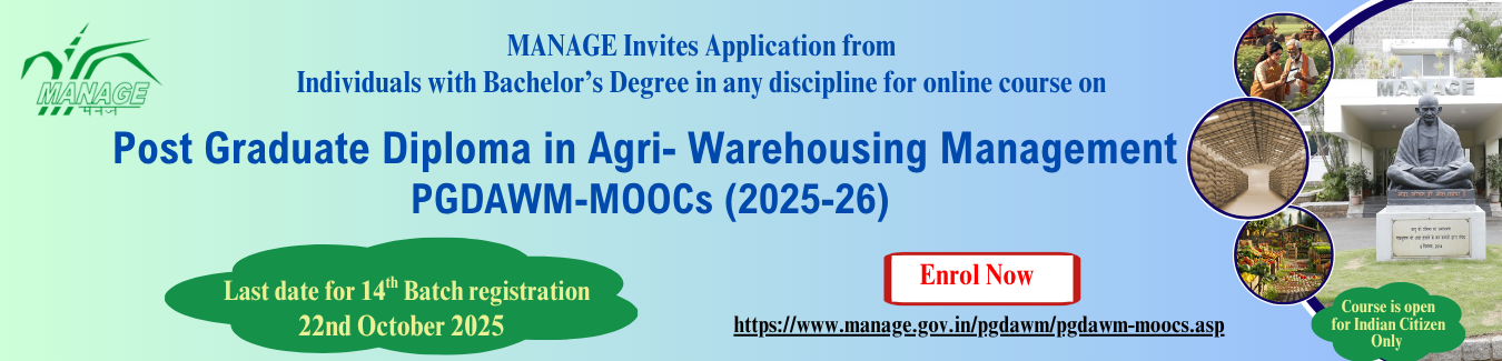 RKVY-RAFTAAR Program:![]() Call for MANAGE-CIA Cohort-14 Applications from Agripreneurs & Startups Poster | AoP | SoP | SAIP | Apply |