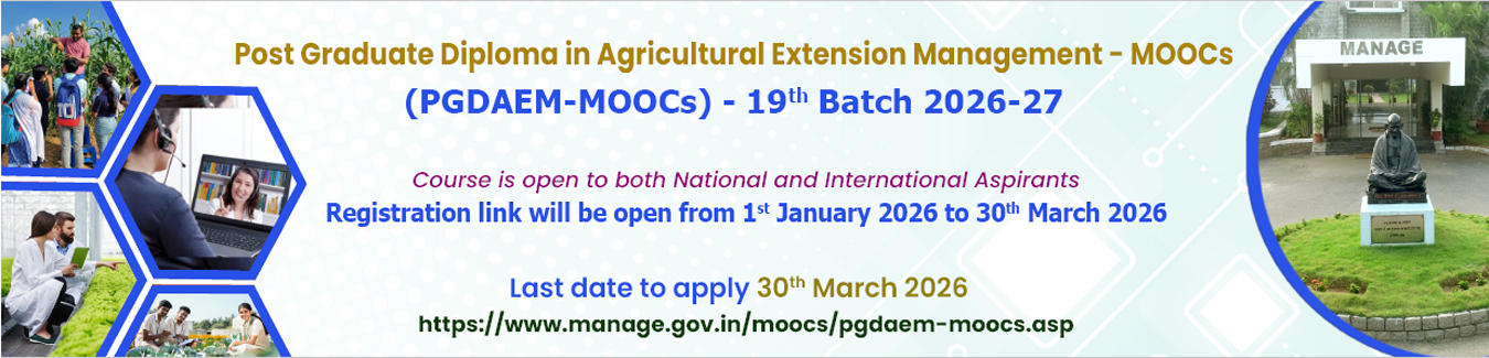 63 | National Young Professionals Development Program (NYPDP) on New Competencies, Career Opportunities and Research Priorities in Agricultural Extension...Register Now | 16/03/2026-20/03/2026 | Dr. Saravanan Raj | On-Campus, MANAGE |