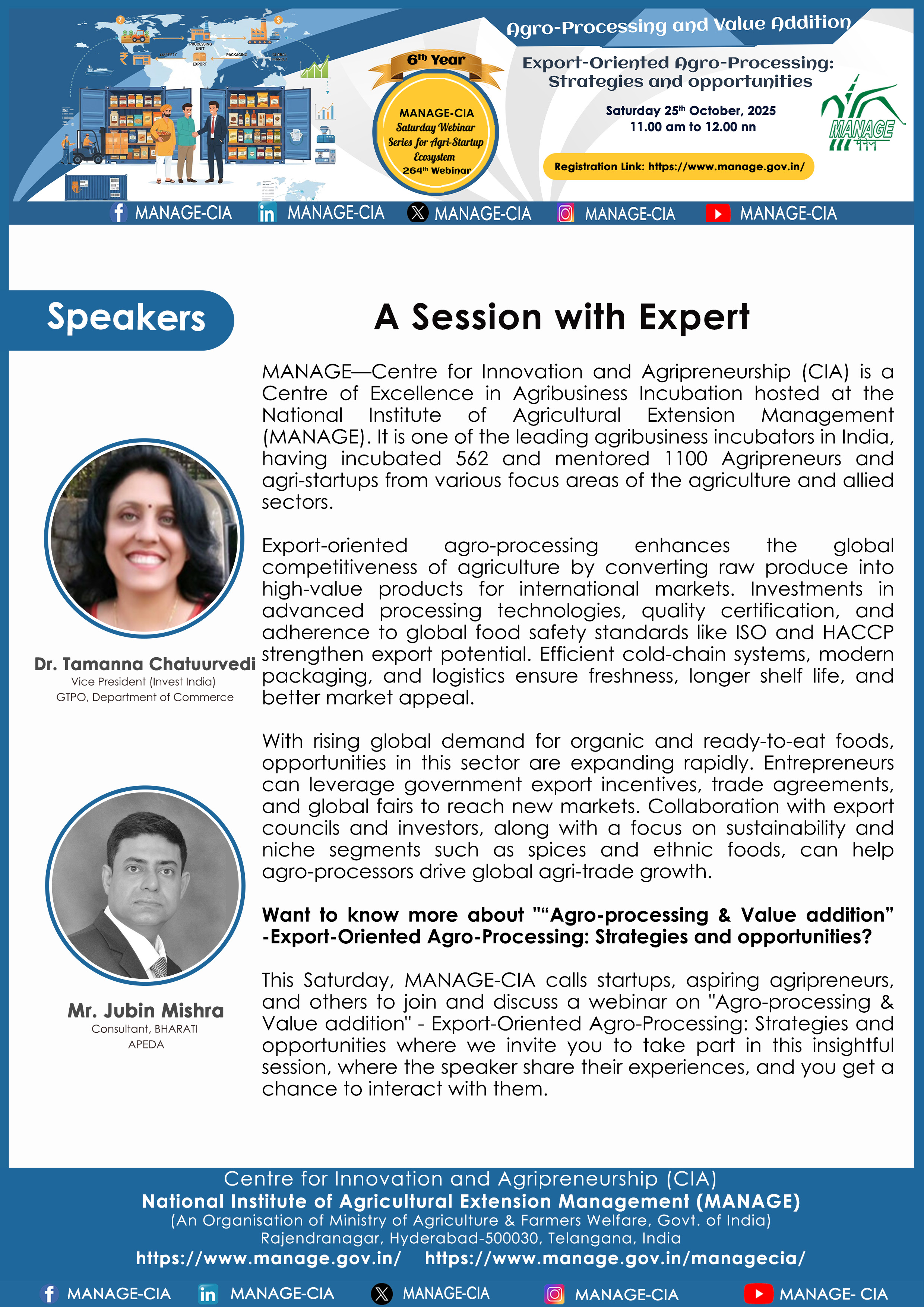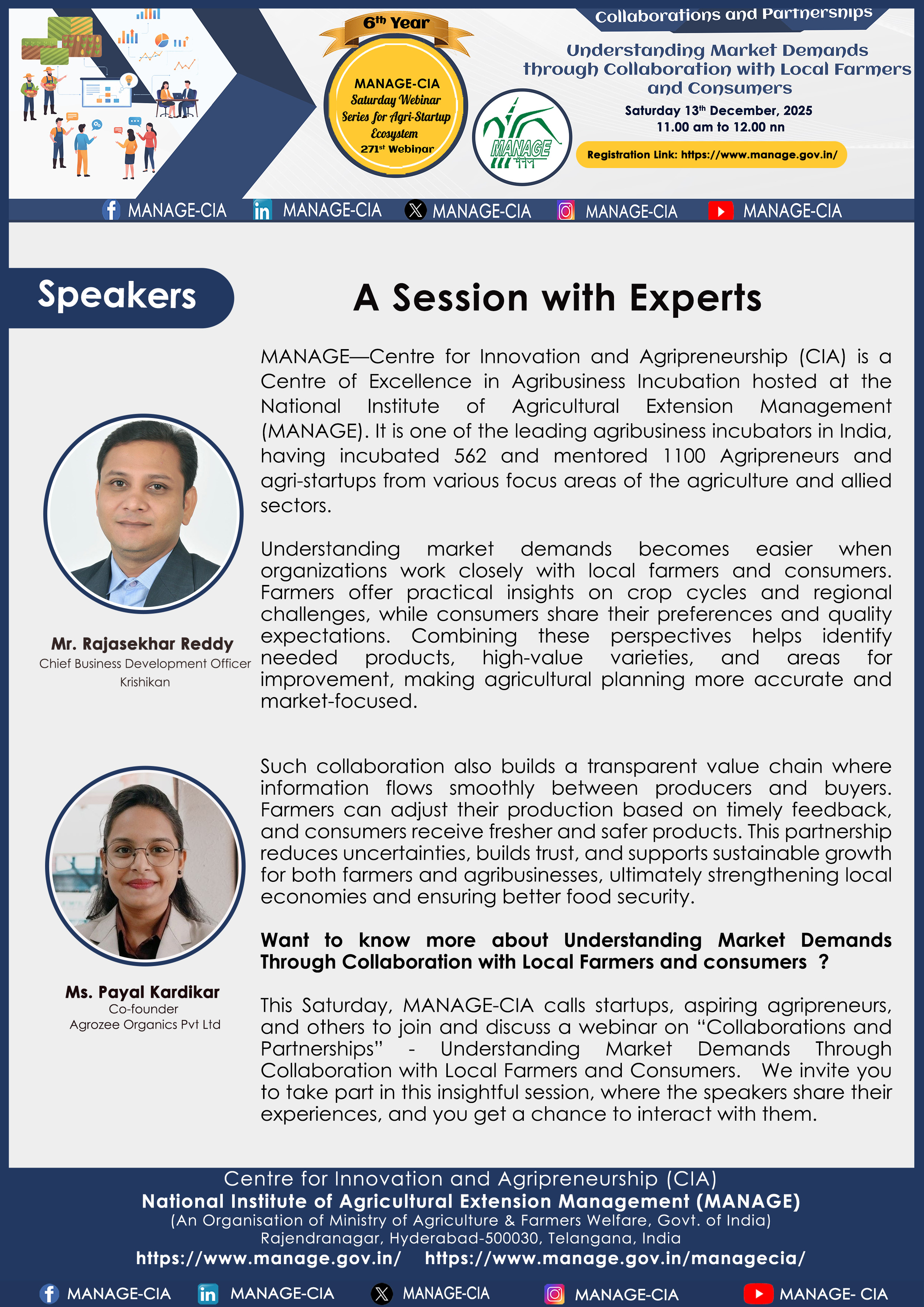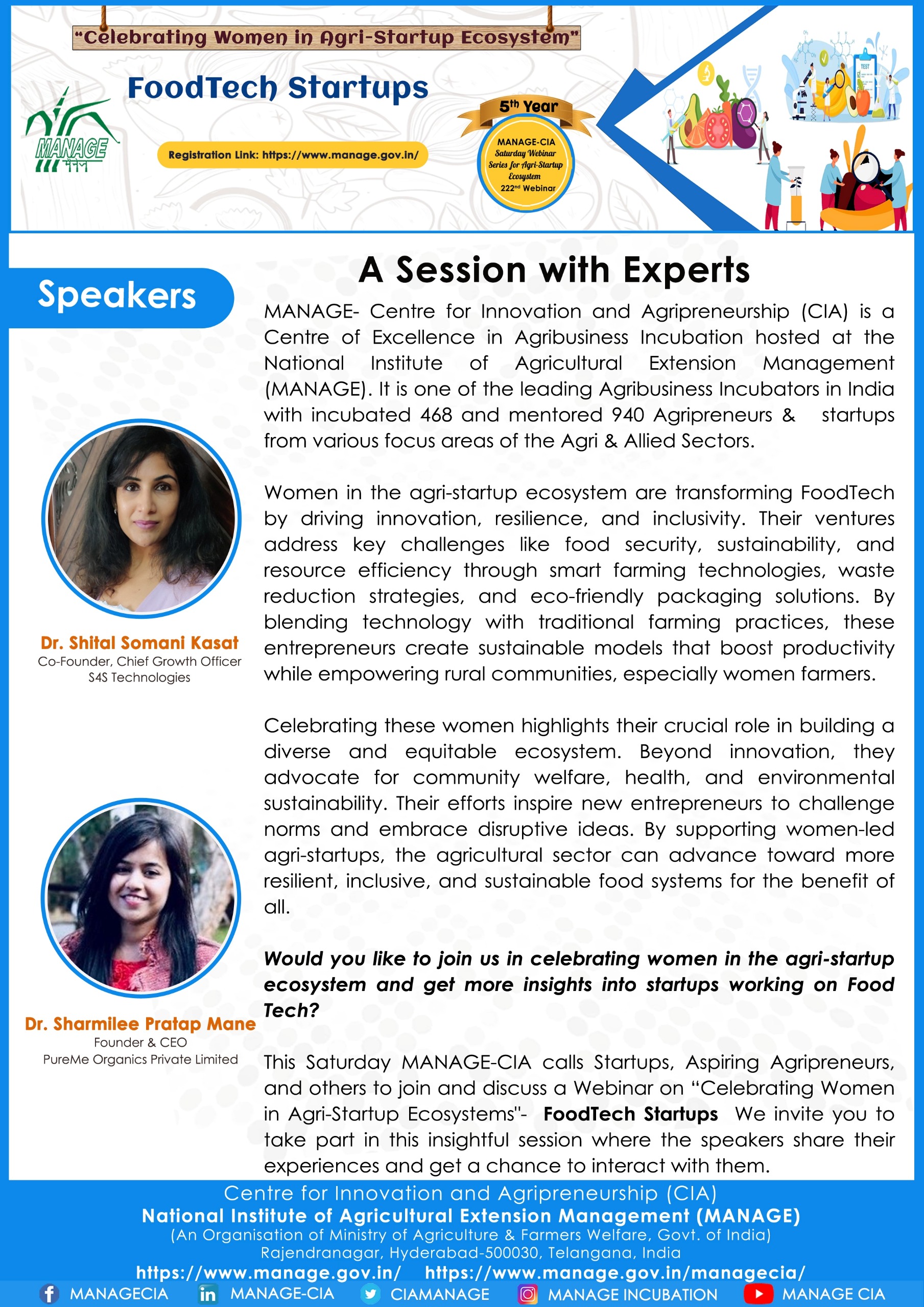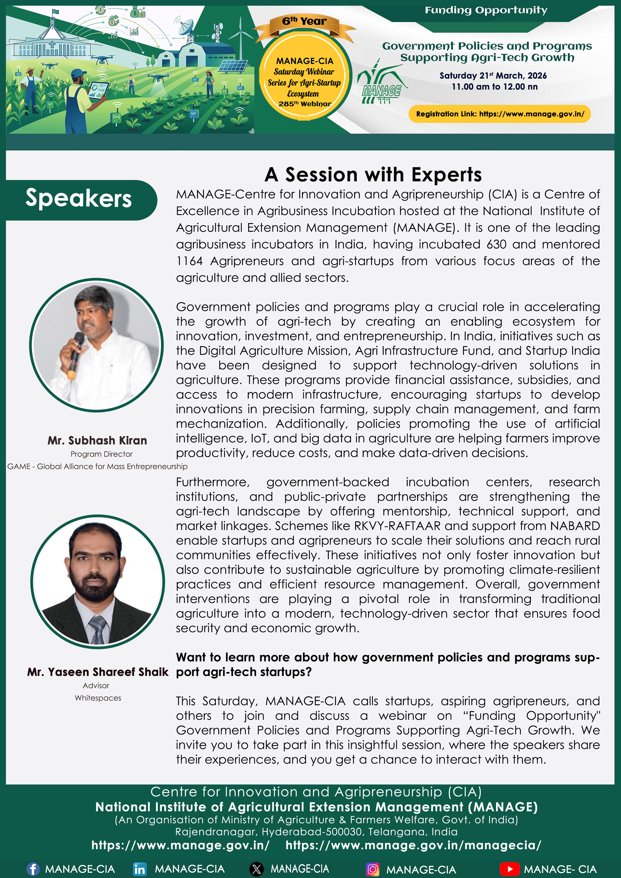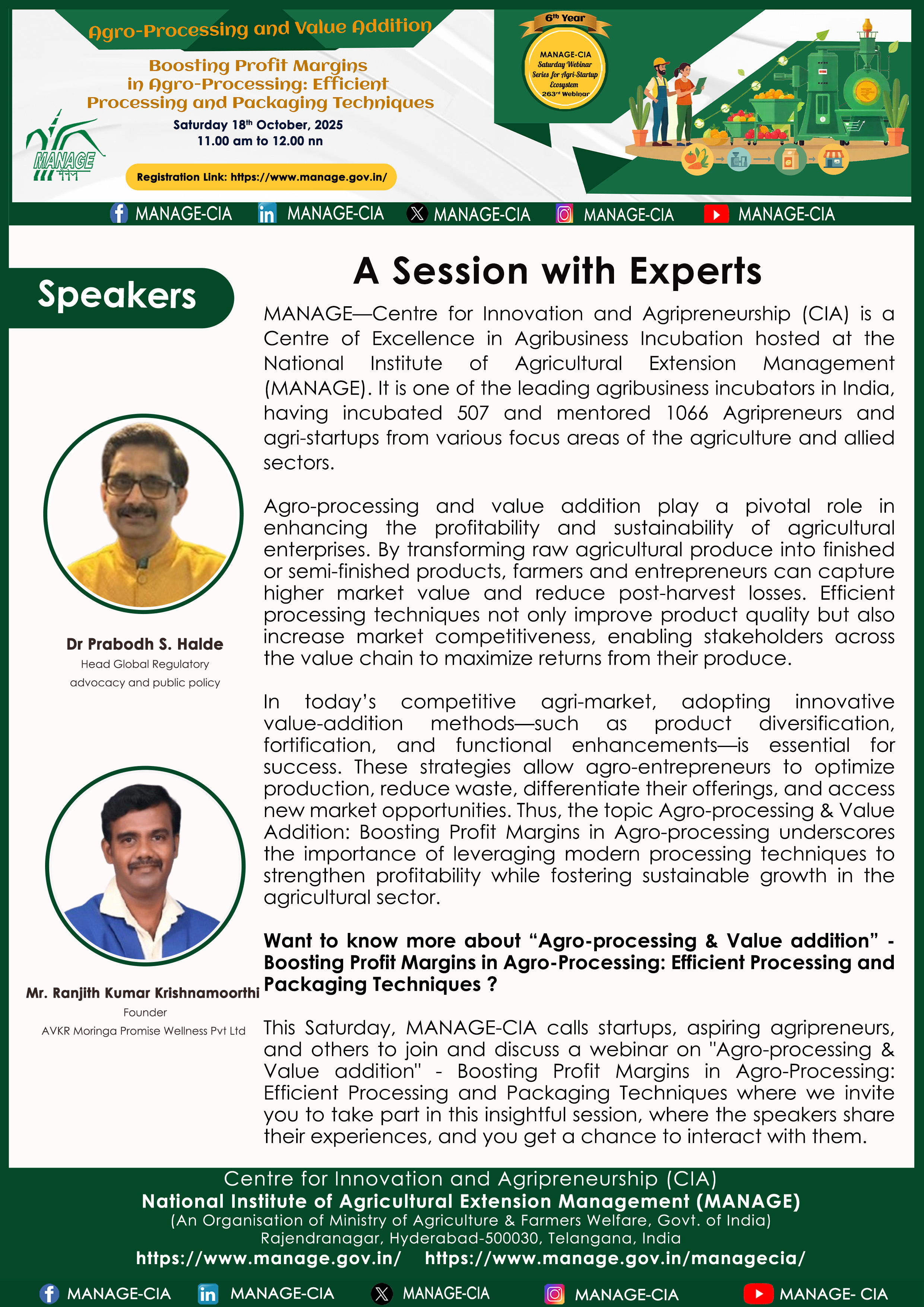 National Institute of Agricultural Extension Management (MANAGE) - Centre for Innovation and Agripreneurship (CIA), has launched “Saturday Webinar Series” to address various important topics relevant to Agri-Startup Eco-System and to create awareness among the Agri-Startups, Agri Entrepreneurs, Faculties, Scholars and Students, across India. Webinars are being conducted every Saturday 11 AM – 1 PM IST.