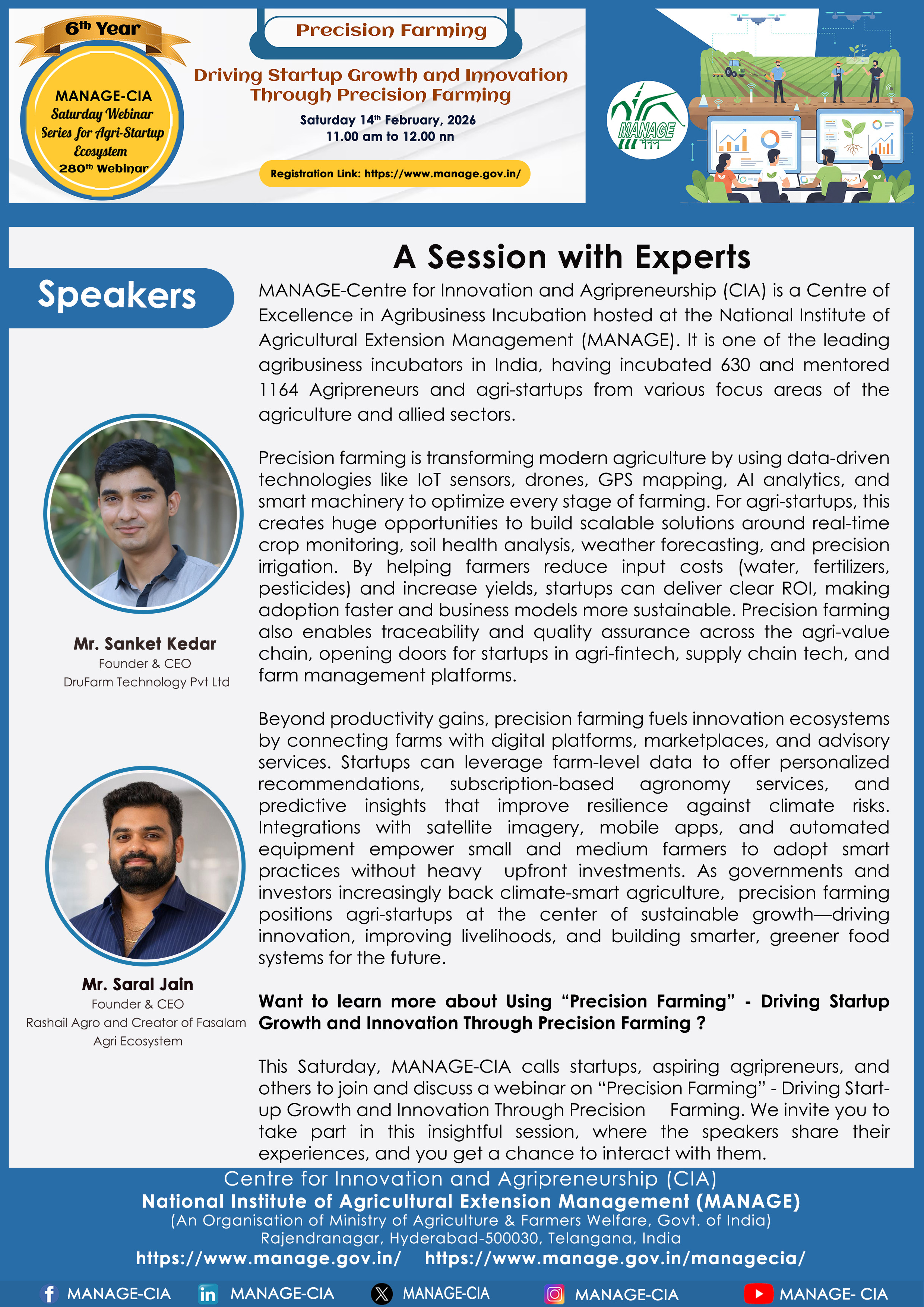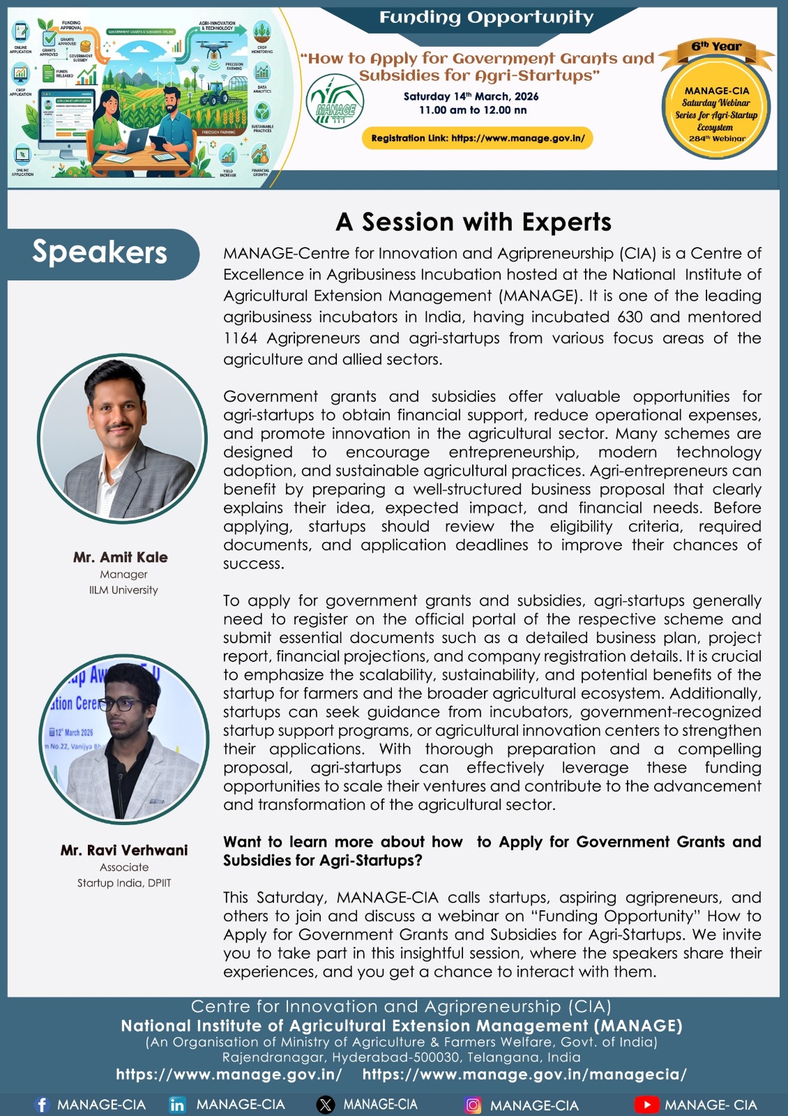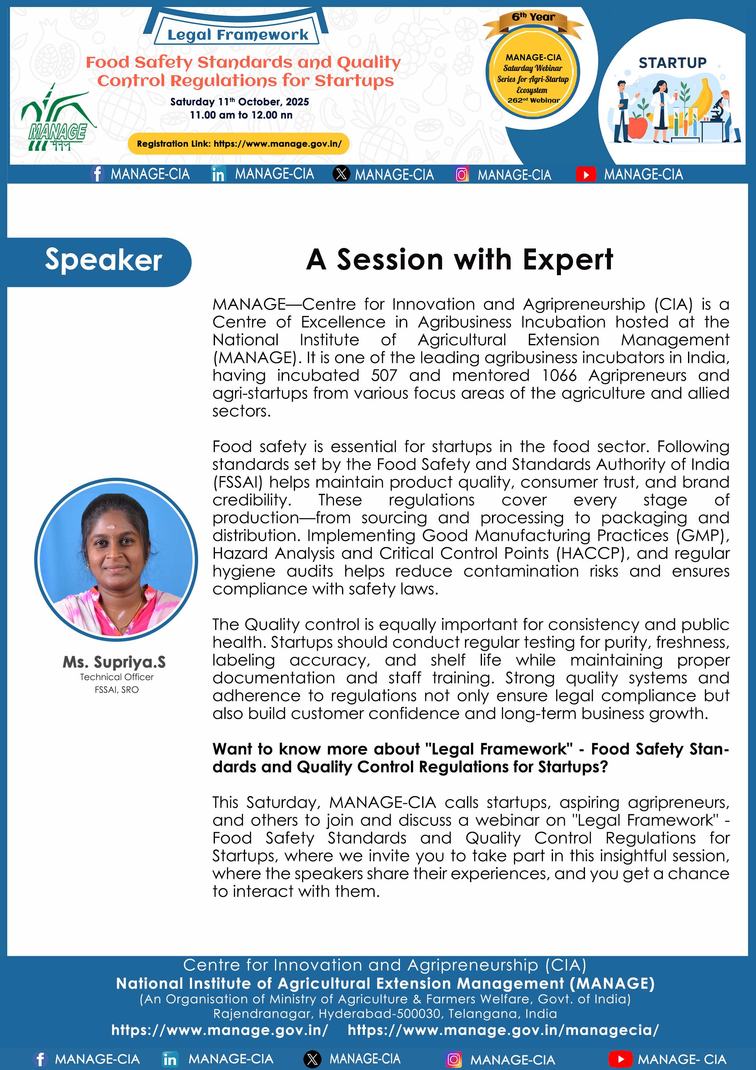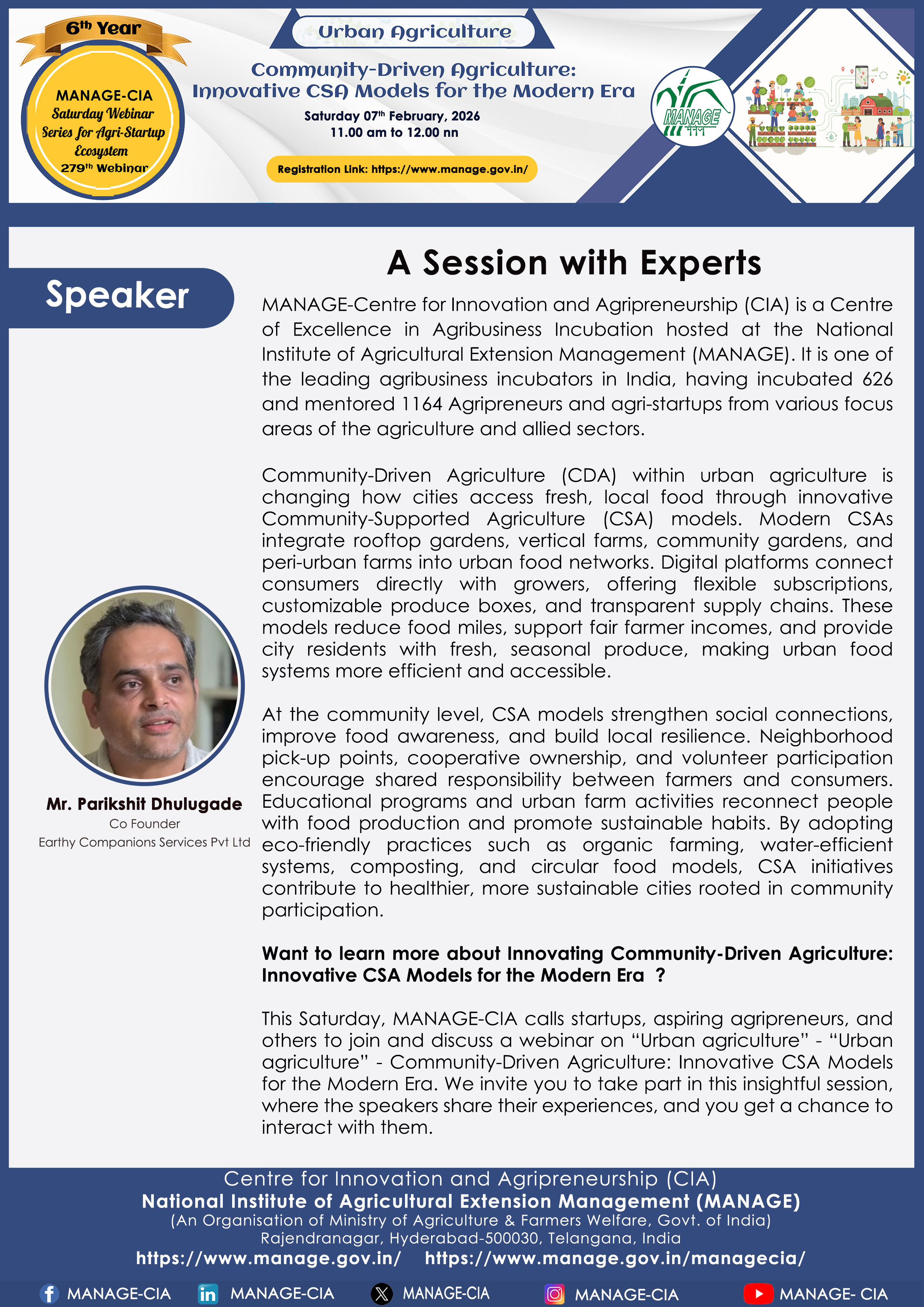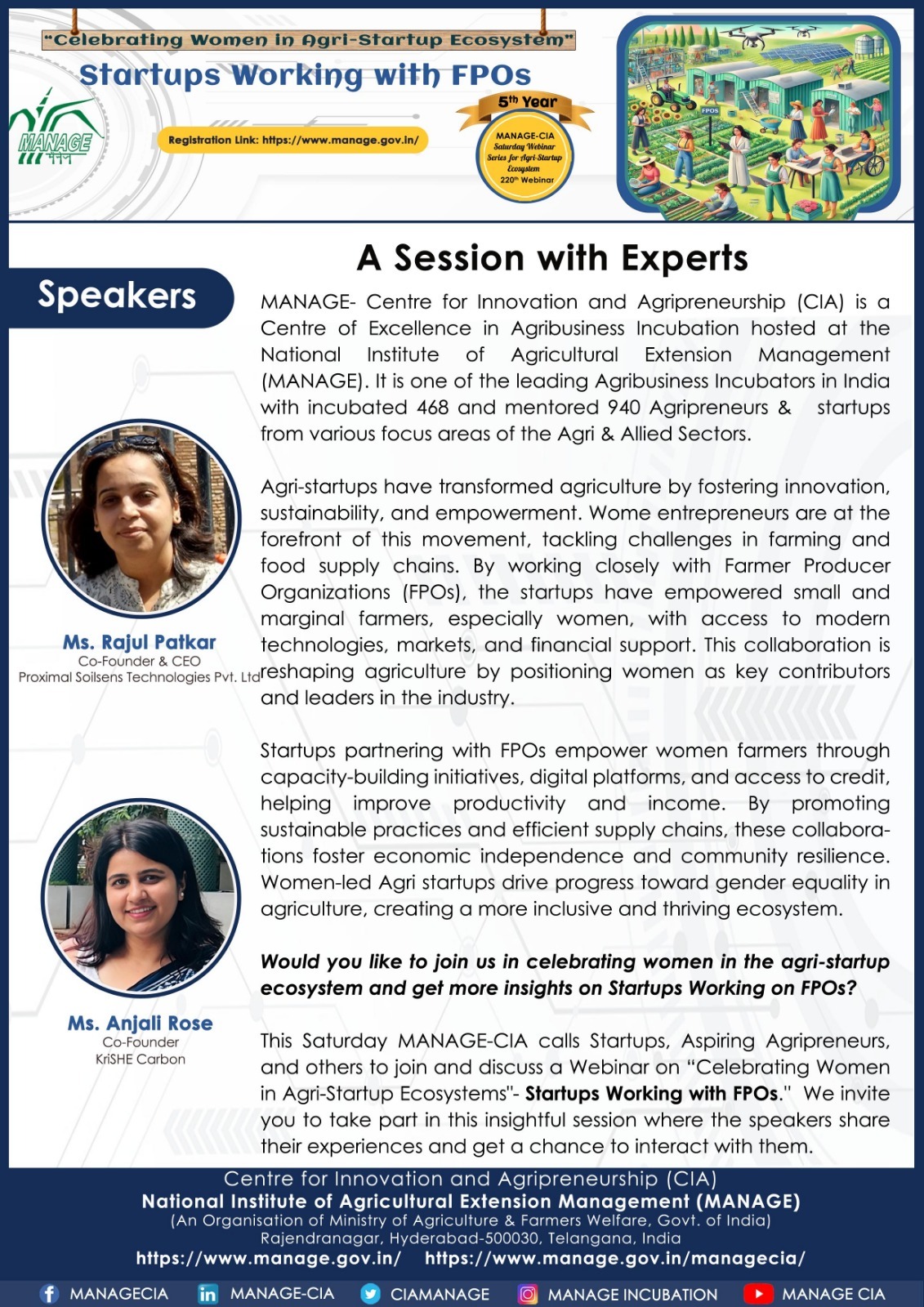 National Institute of Agricultural Extension Management (MANAGE) - Centre for Innovation and Agripreneurship (CIA), has launched “Saturday Webinar Series” to address various important topics relevant to Agri-Startup Eco-System and to create awareness among the Agri-Startups, Agri Entrepreneurs, Faculties, Scholars and Students, across India. Webinars are being conducted every Saturday 11 AM – 1 PM IST.
