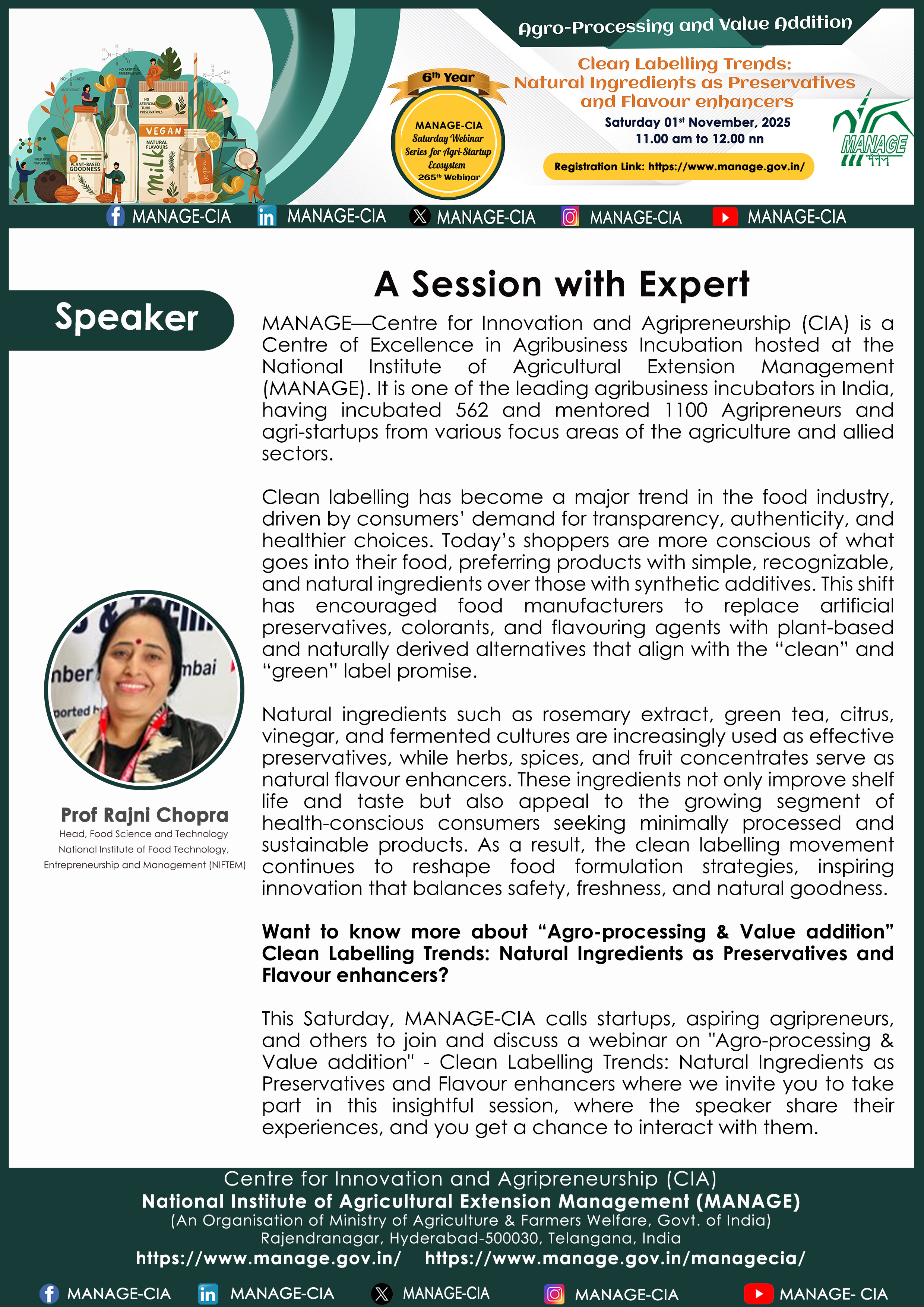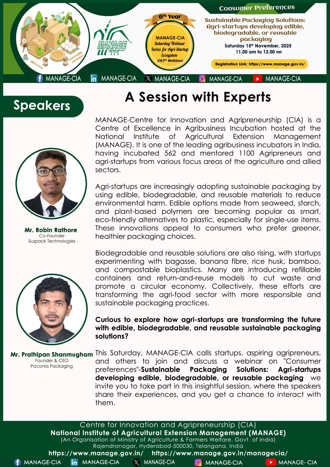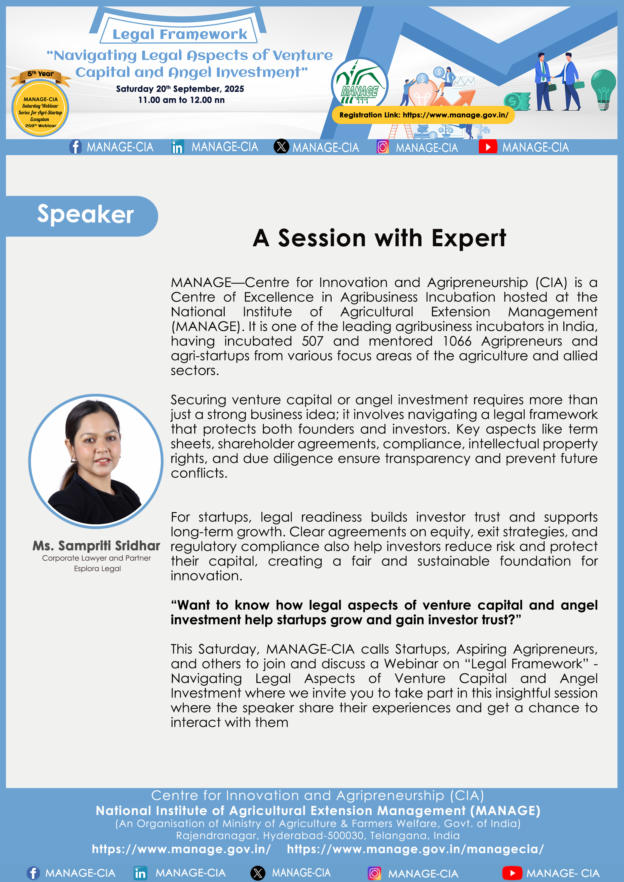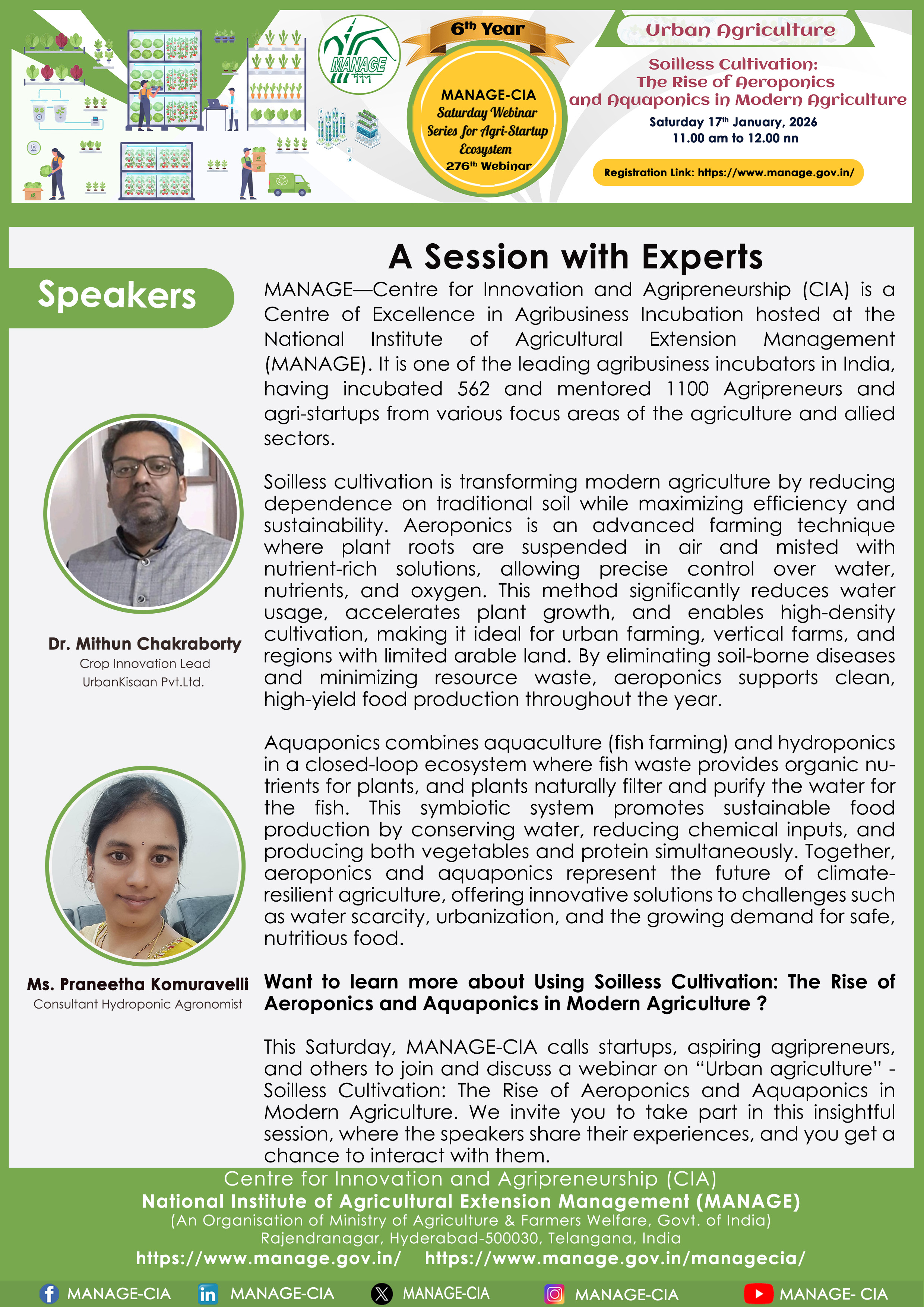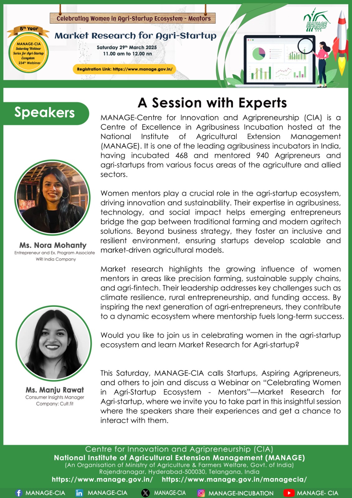 National Institute of Agricultural Extension Management (MANAGE) - Centre for Innovation and Agripreneurship (CIA), has launched “Saturday Webinar Series” to address various important topics relevant to Agri-Startup Eco-System and to create awareness among the Agri-Startups, Agri Entrepreneurs, Faculties, Scholars and Students, across India. Webinars are being conducted every Saturday 11 AM – 1 PM IST.