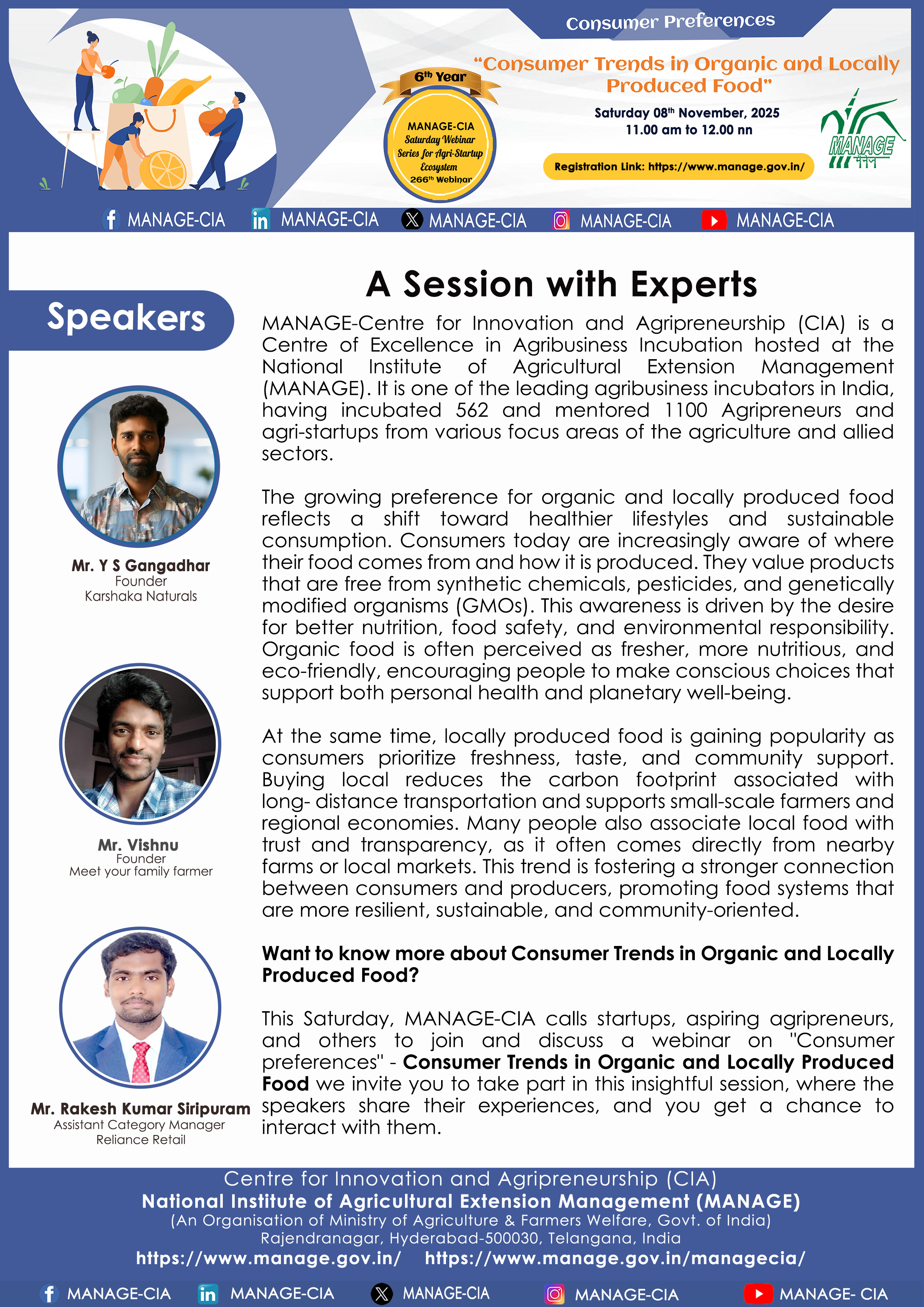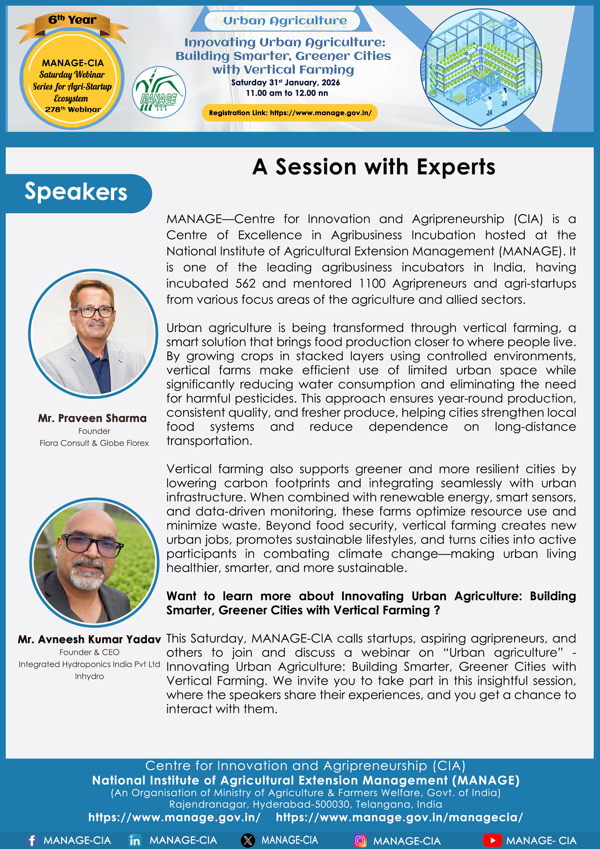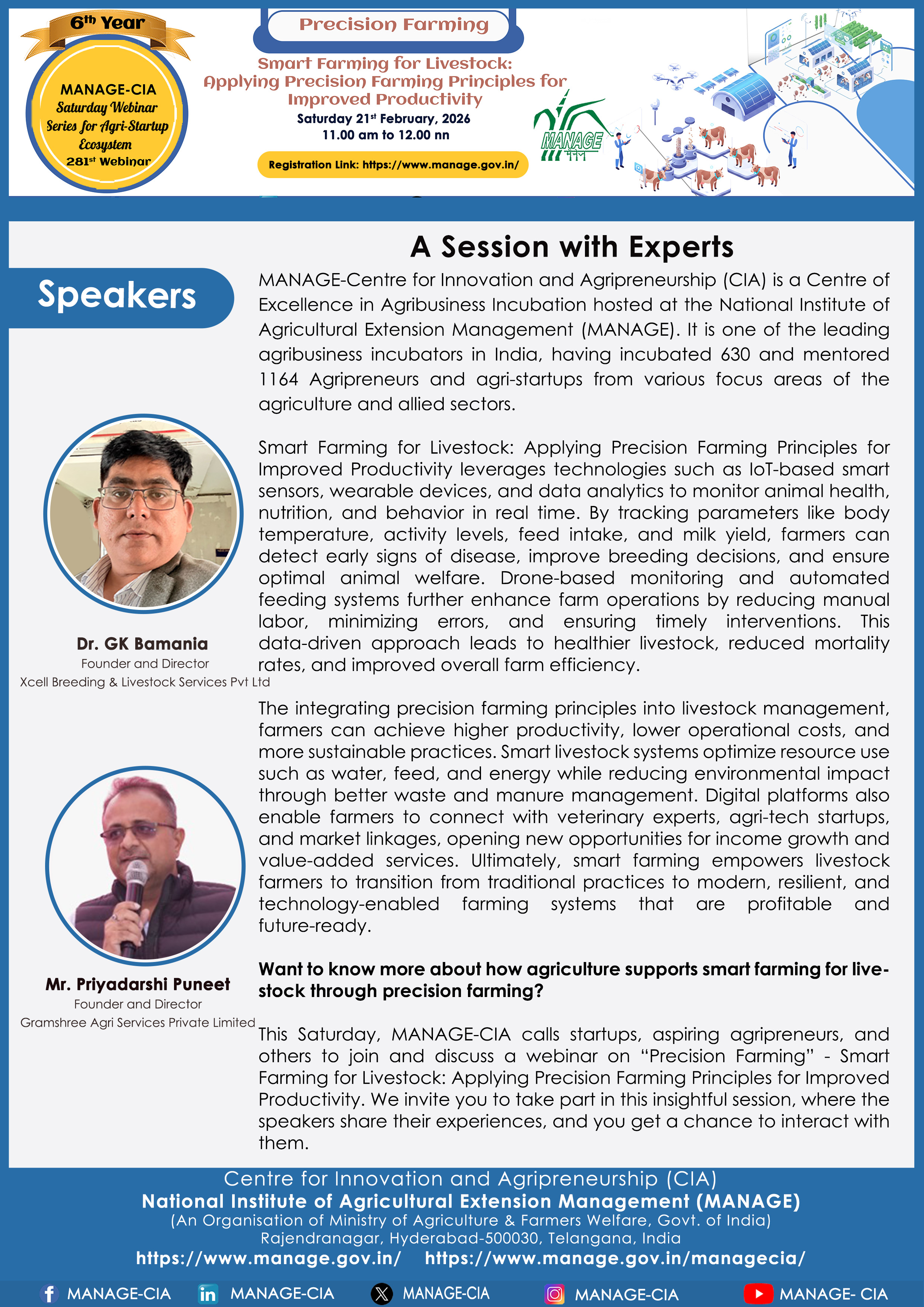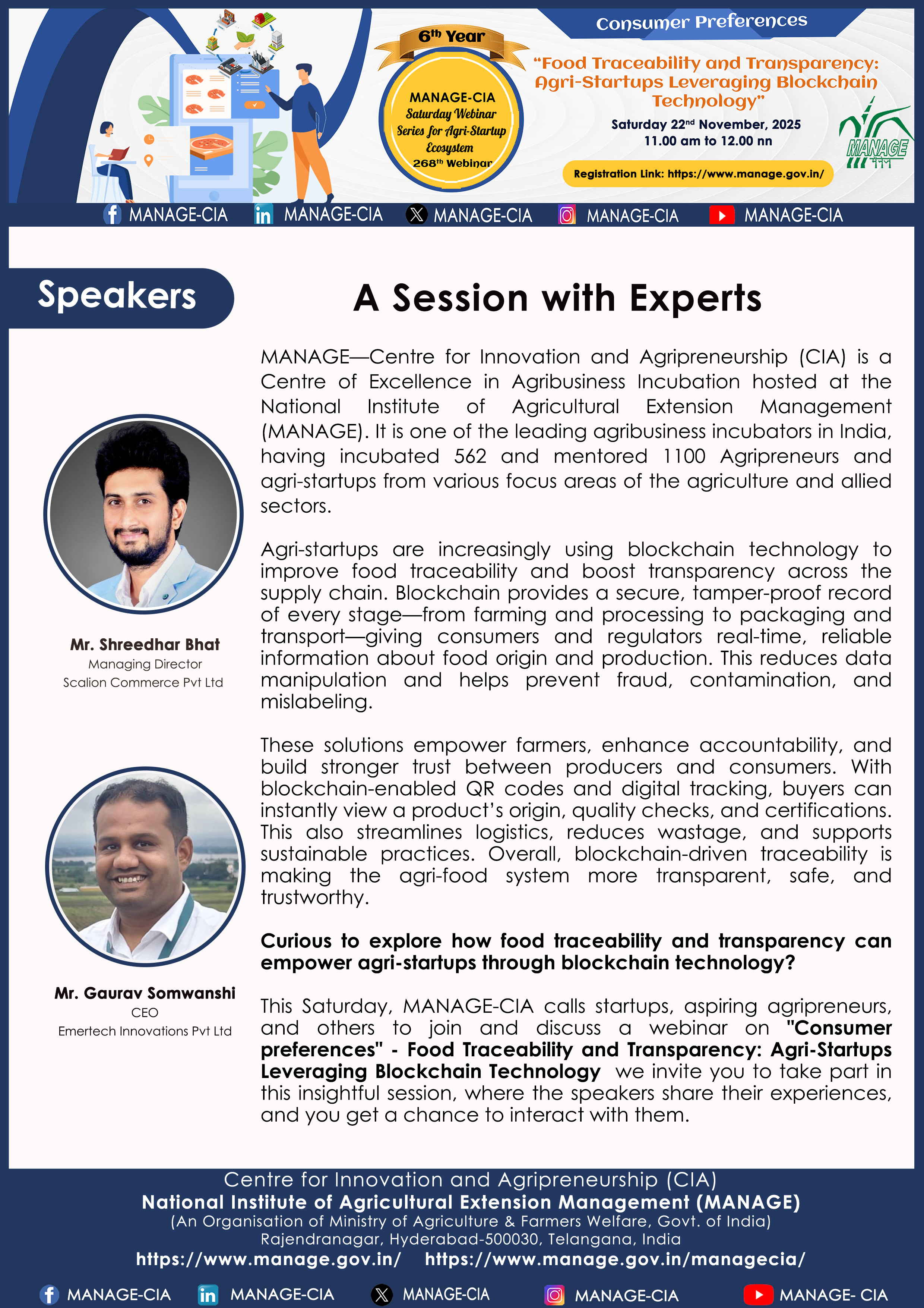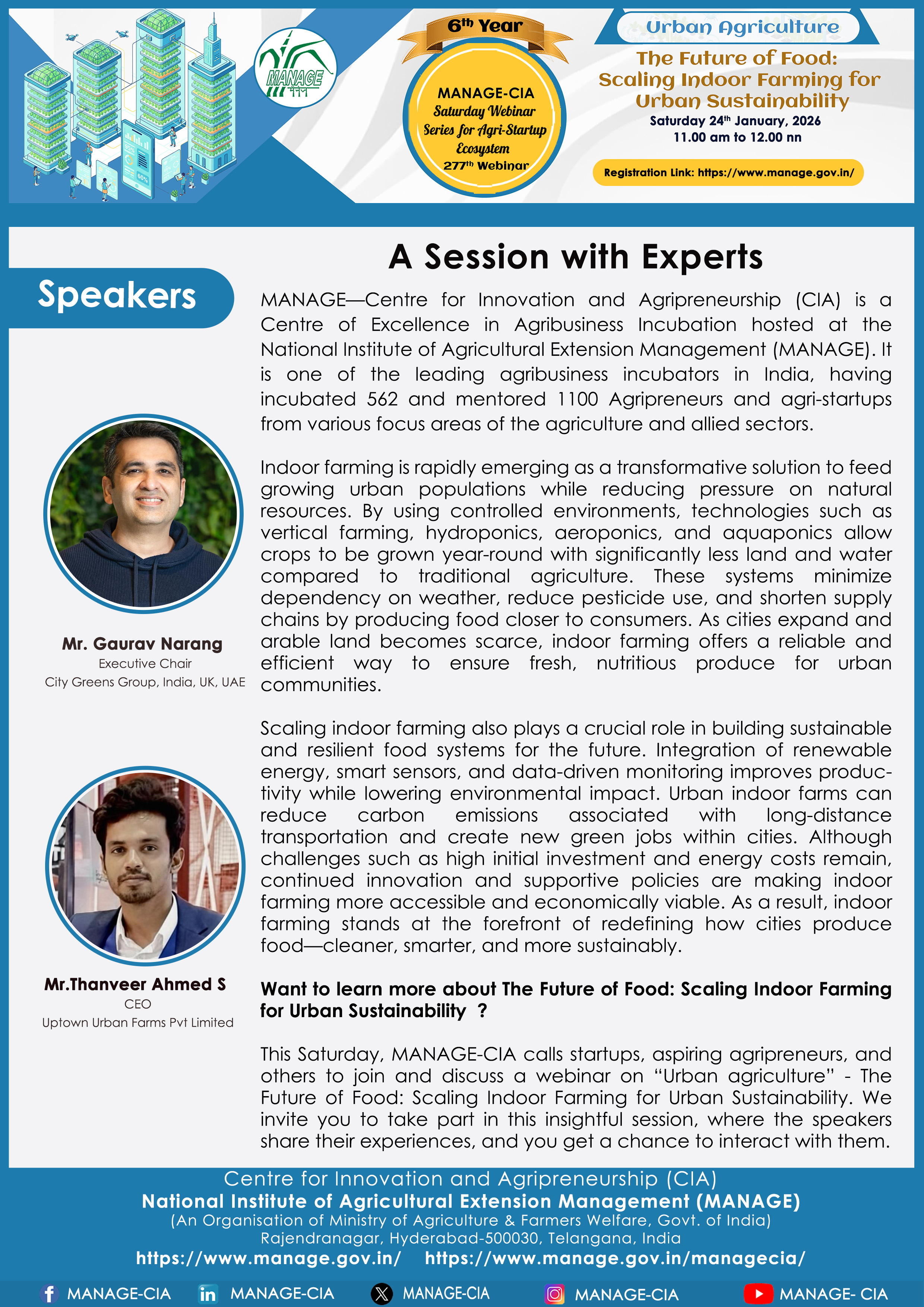 National Institute of Agricultural Extension Management (MANAGE) - Centre for Innovation and Agripreneurship (CIA), has launched “Saturday Webinar Series” to address various important topics relevant to Agri-Startup Eco-System and to create awareness among the Agri-Startups, Agri Entrepreneurs, Faculties, Scholars and Students, across India. Webinars are being conducted every Saturday 11 AM – 1 PM IST.