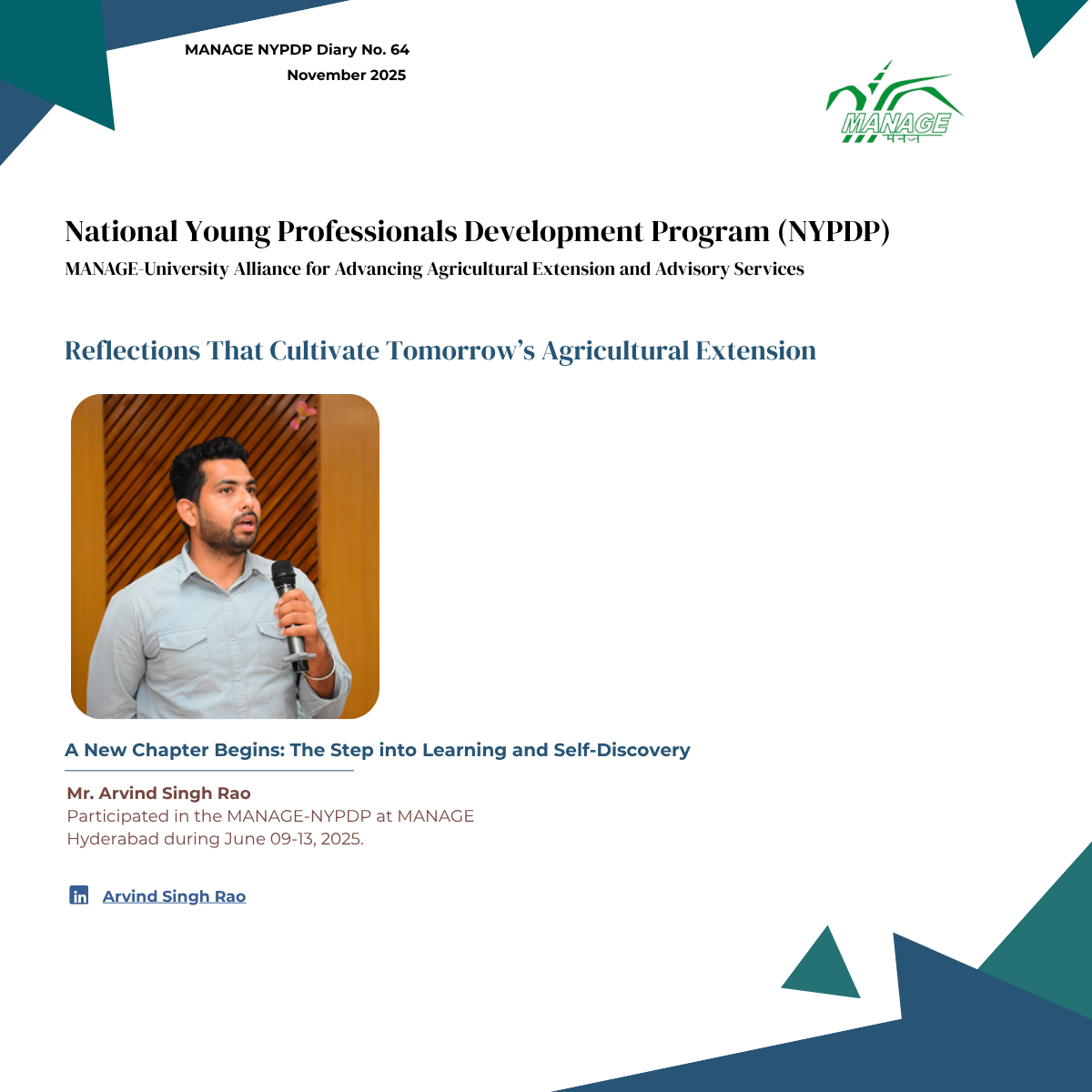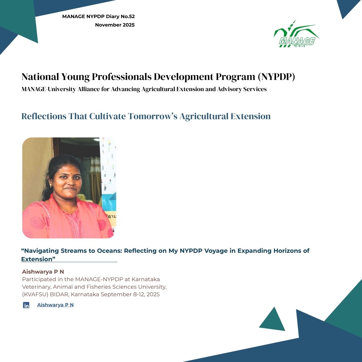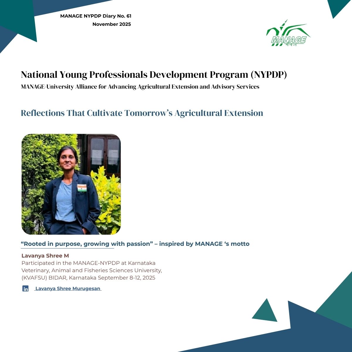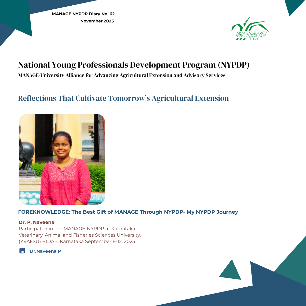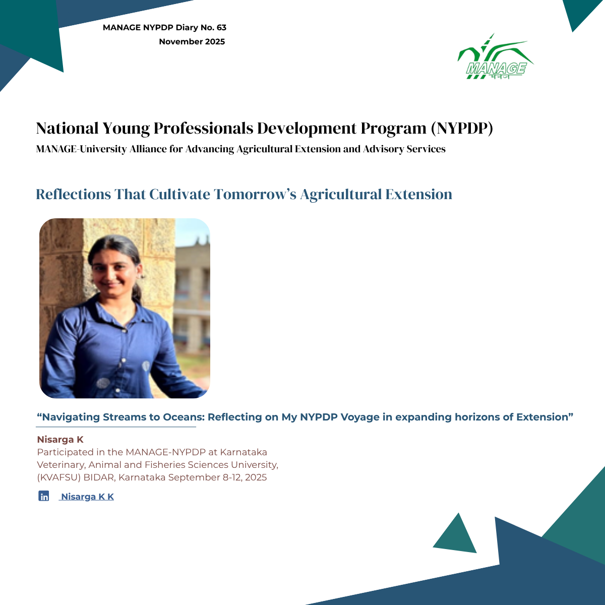 Saravanan, R., Raahalya, S., and Jeena, P. (Eds.). 2025. MANAGE NYPDP Diaries: Reflections That Cultivate Tomorrow’s Agricultural Extension (Vol. I). National Institute of Agricultural Extension Management (MANAGE), Hyderabad, India, 199p.