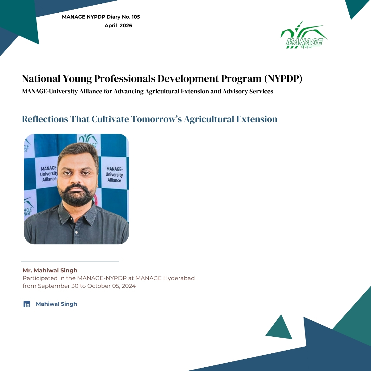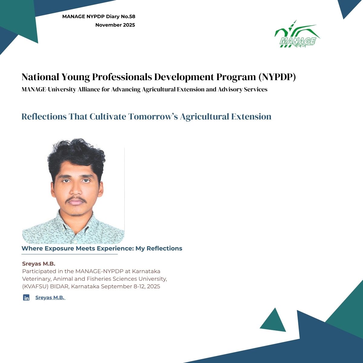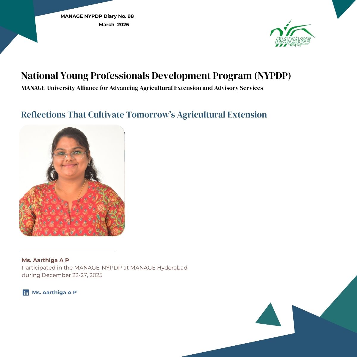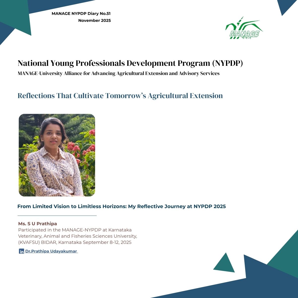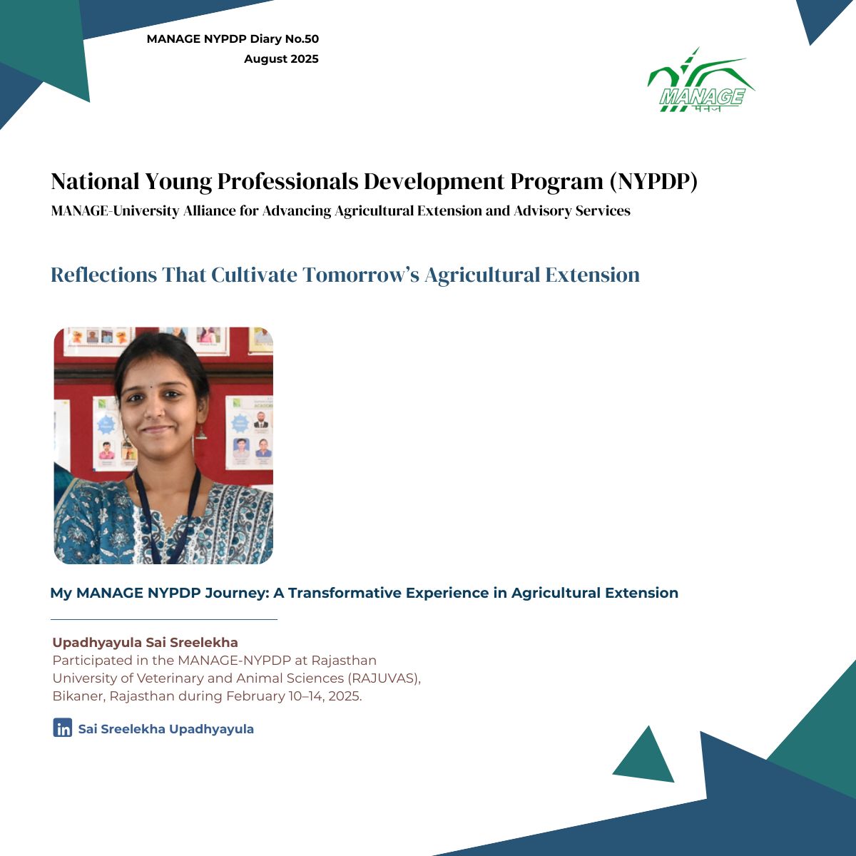 Saravanan, R., Raahalya, S., and Jeena, P. (Eds.). 2025. MANAGE NYPDP Diaries: Reflections That Cultivate Tomorrow’s Agricultural Extension (Vol. I). National Institute of Agricultural Extension Management (MANAGE), Hyderabad, India, 199p.