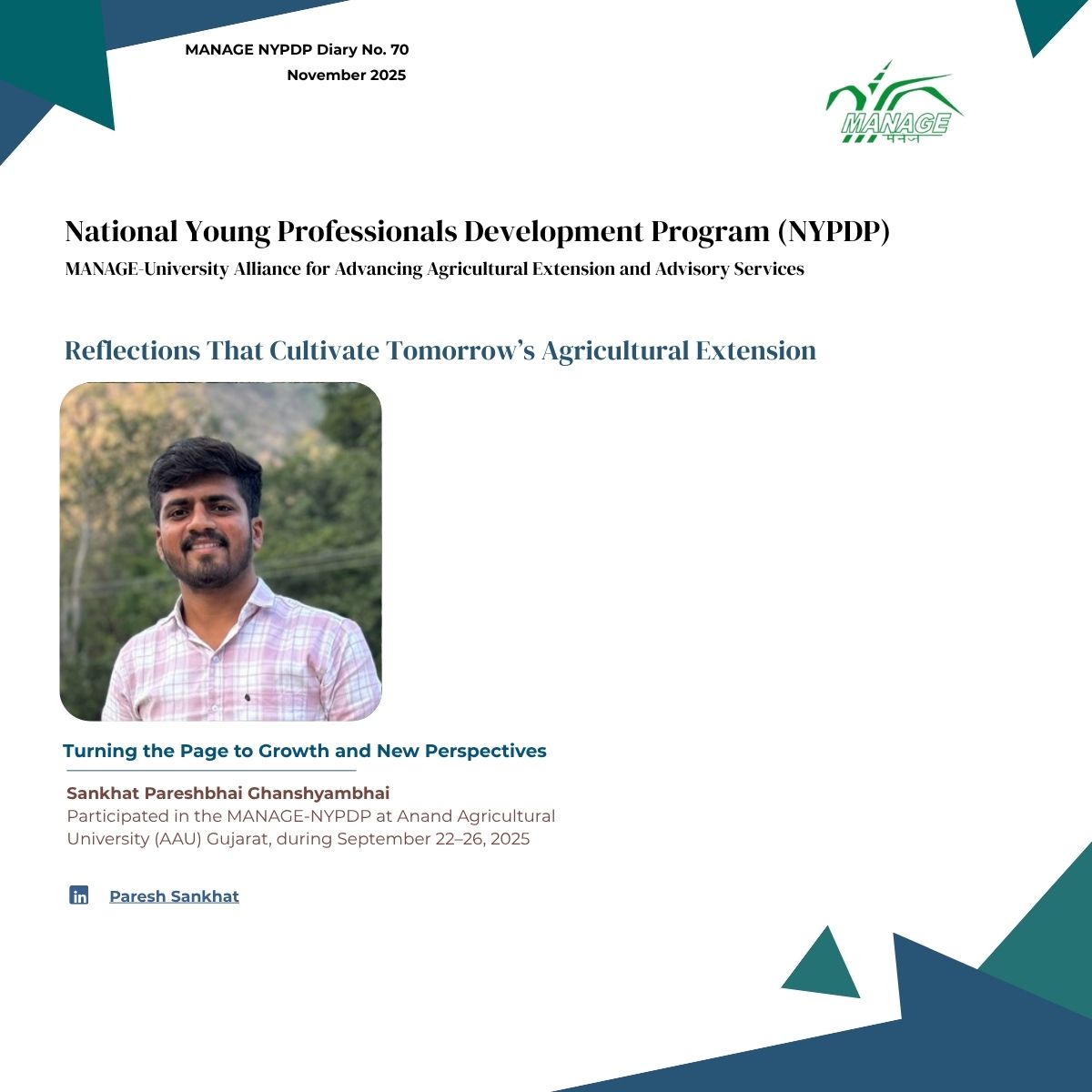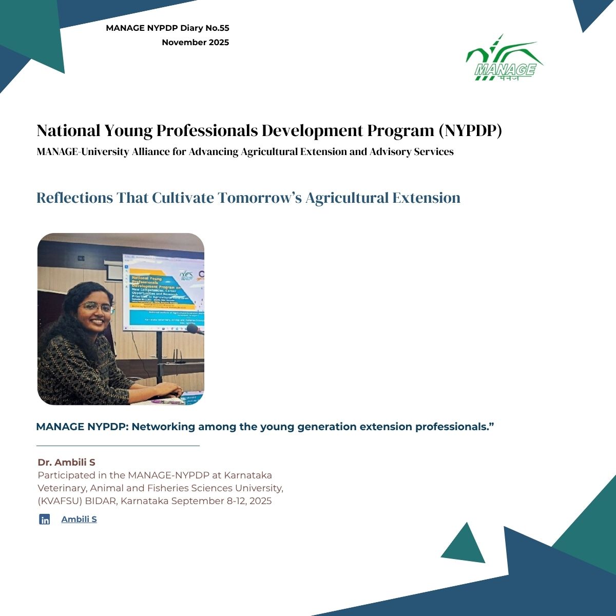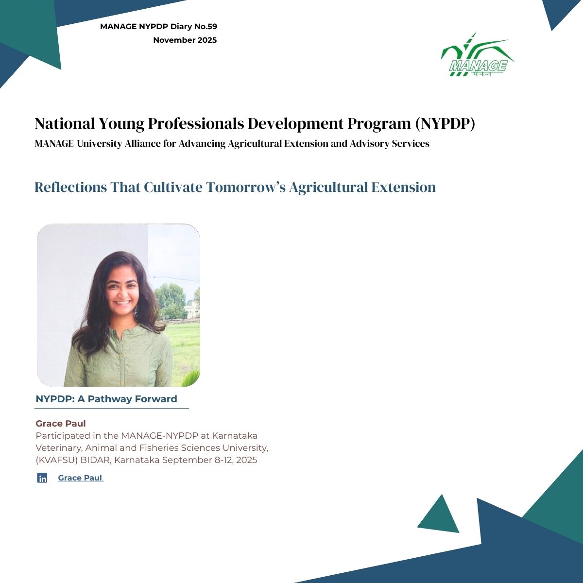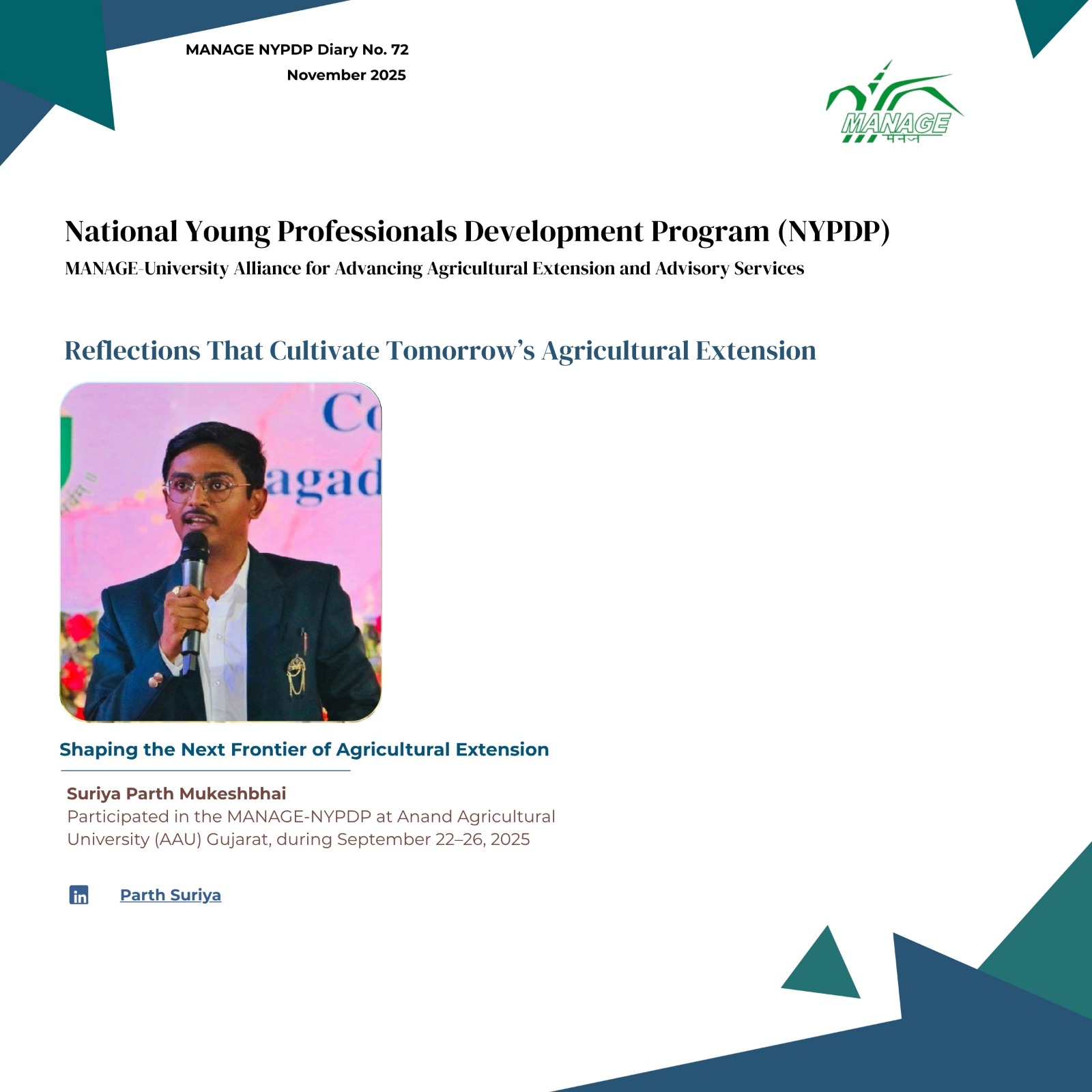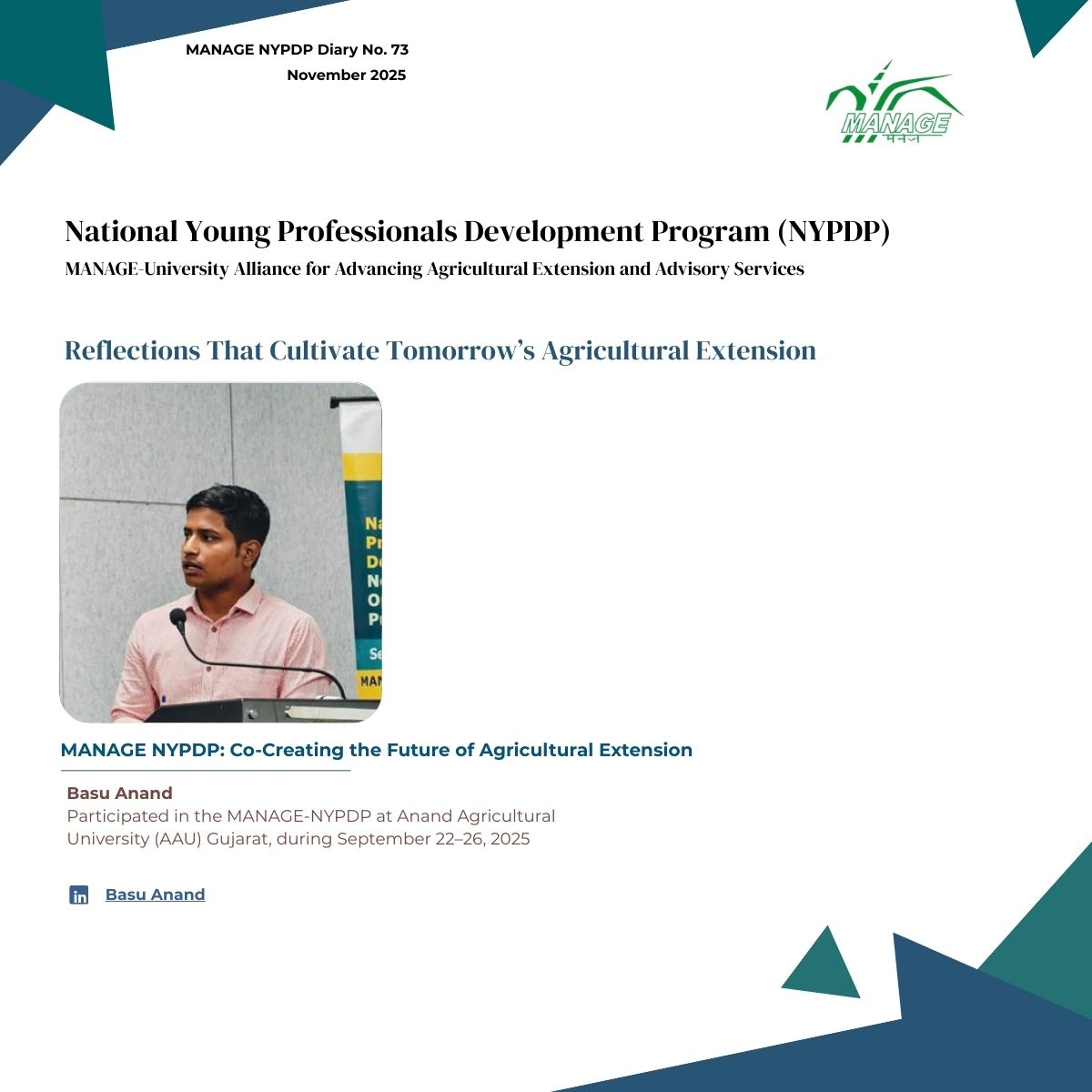 Saravanan, R., Raahalya, S., and Jeena, P. (Eds.). 2025. MANAGE NYPDP Diaries: Reflections That Cultivate Tomorrow’s Agricultural Extension (Vol. I). National Institute of Agricultural Extension Management (MANAGE), Hyderabad, India, 199p.