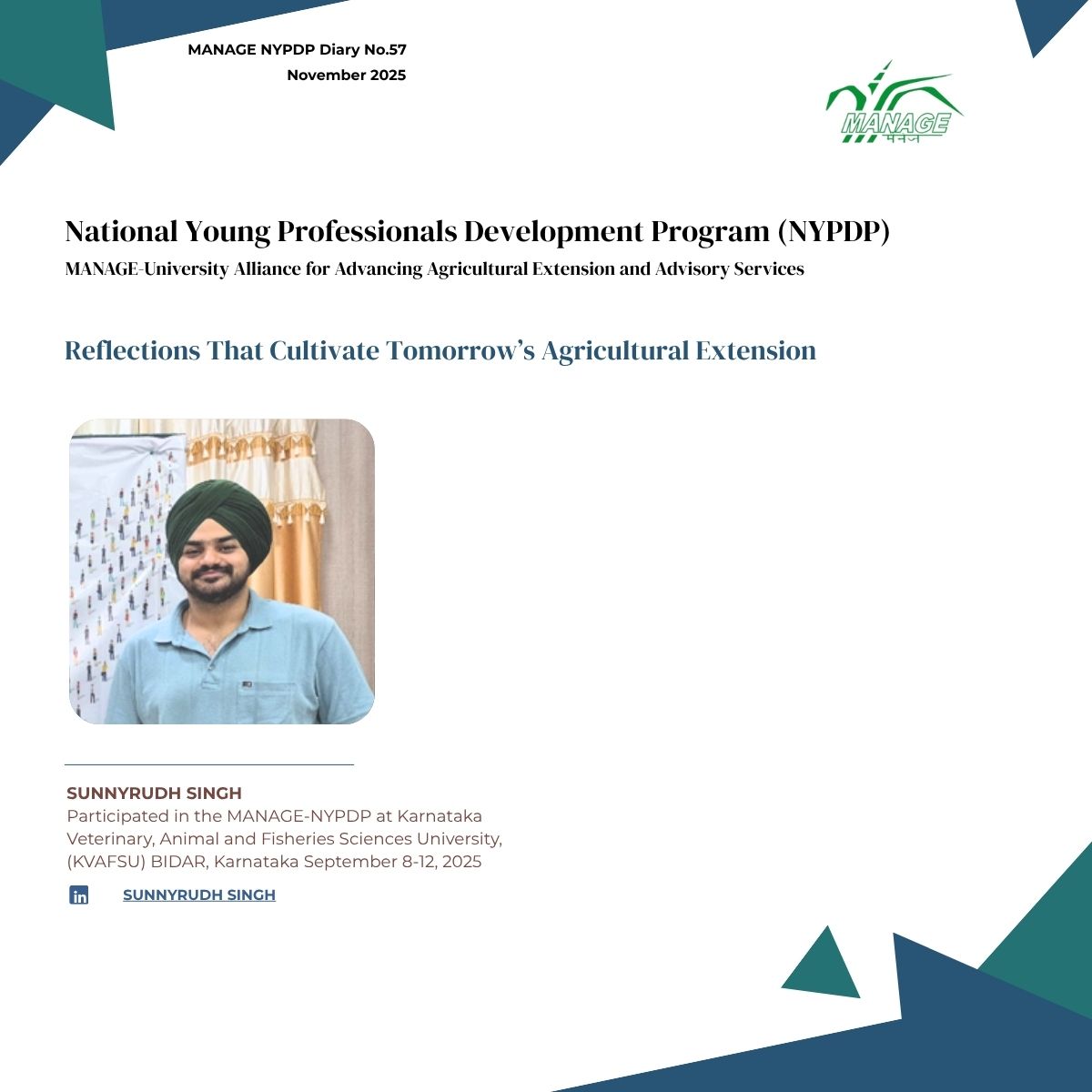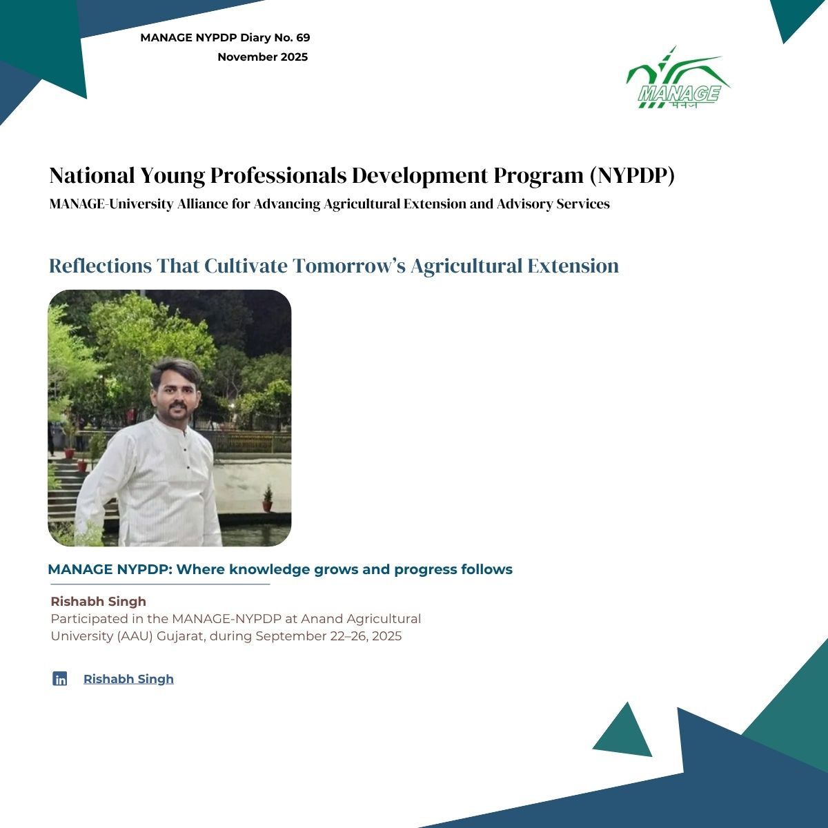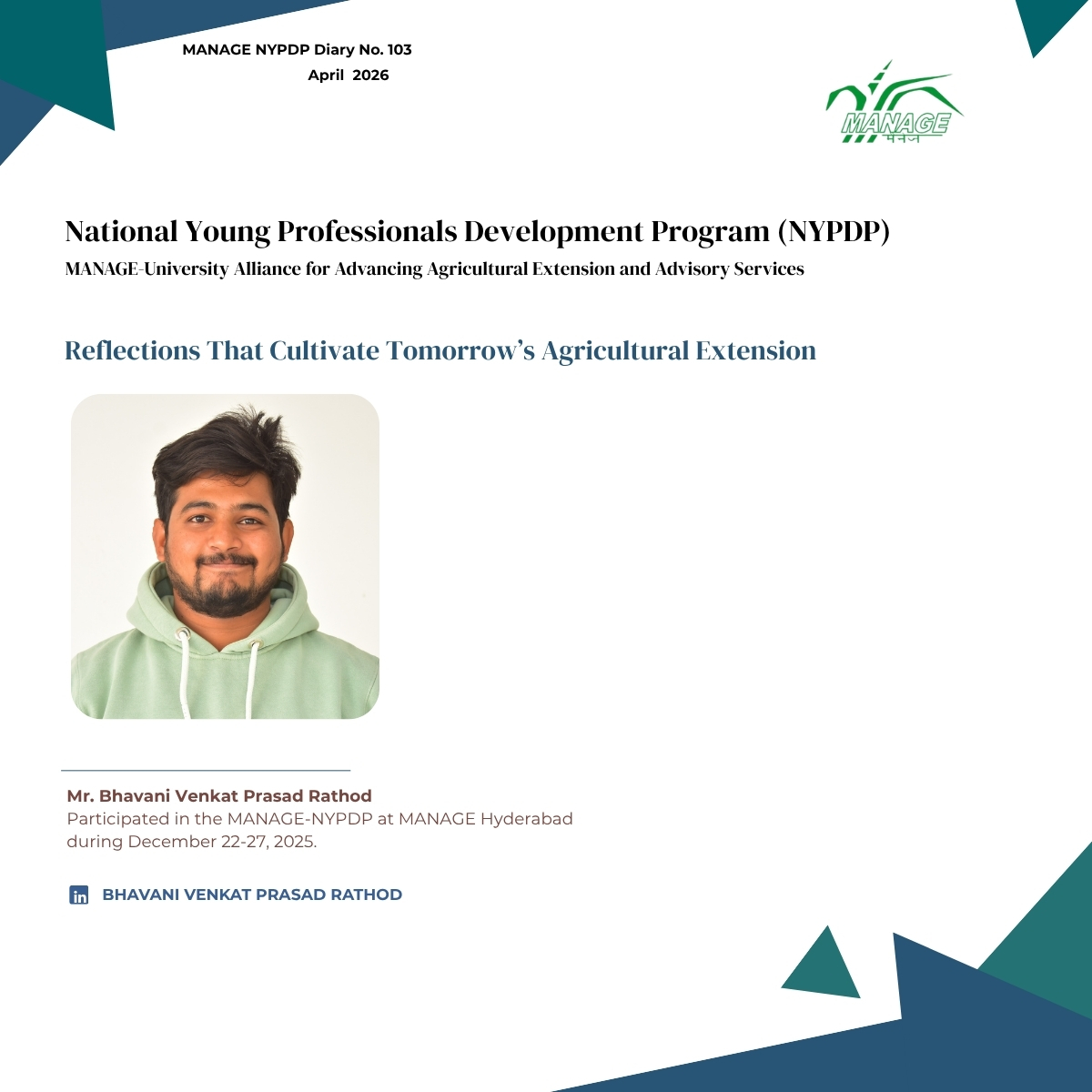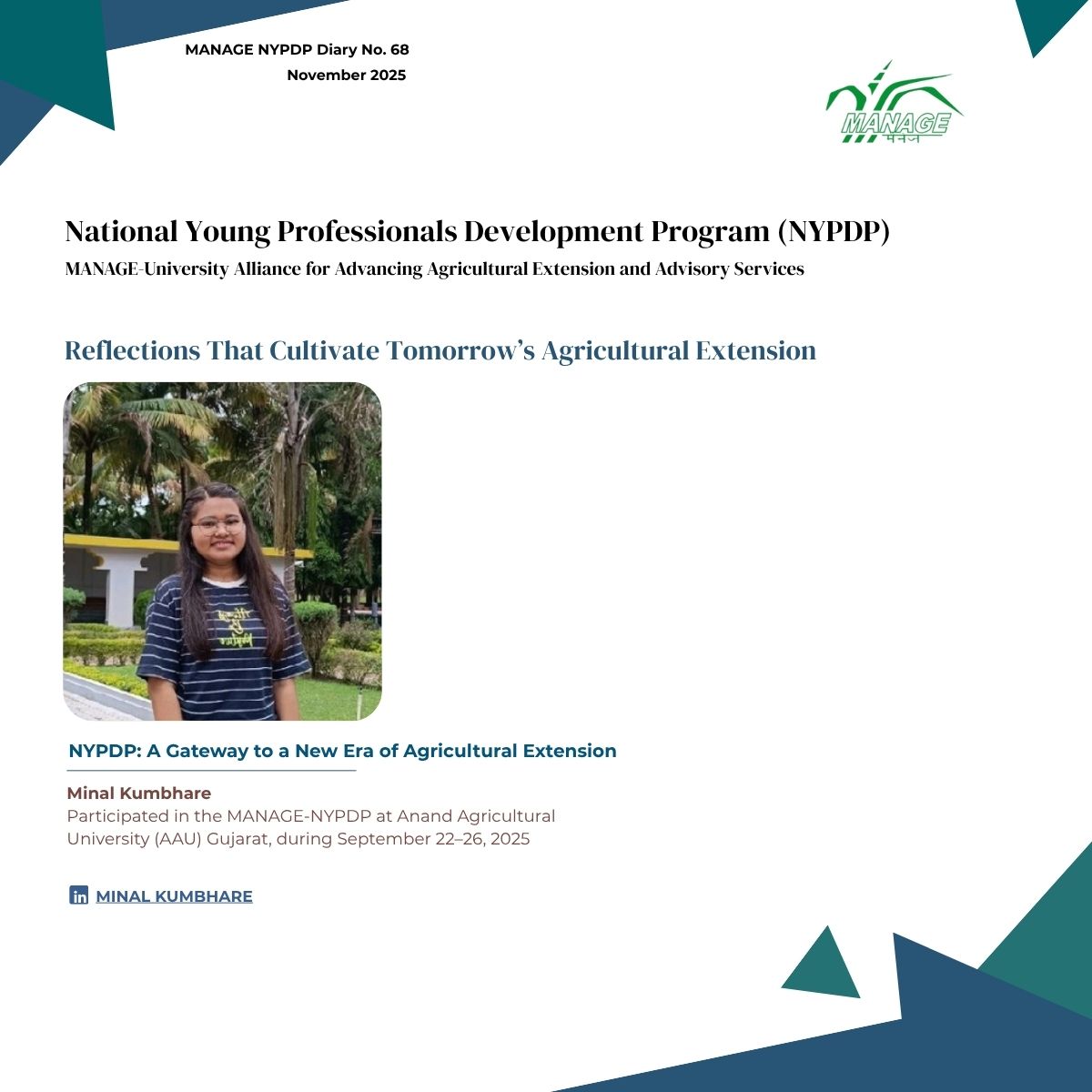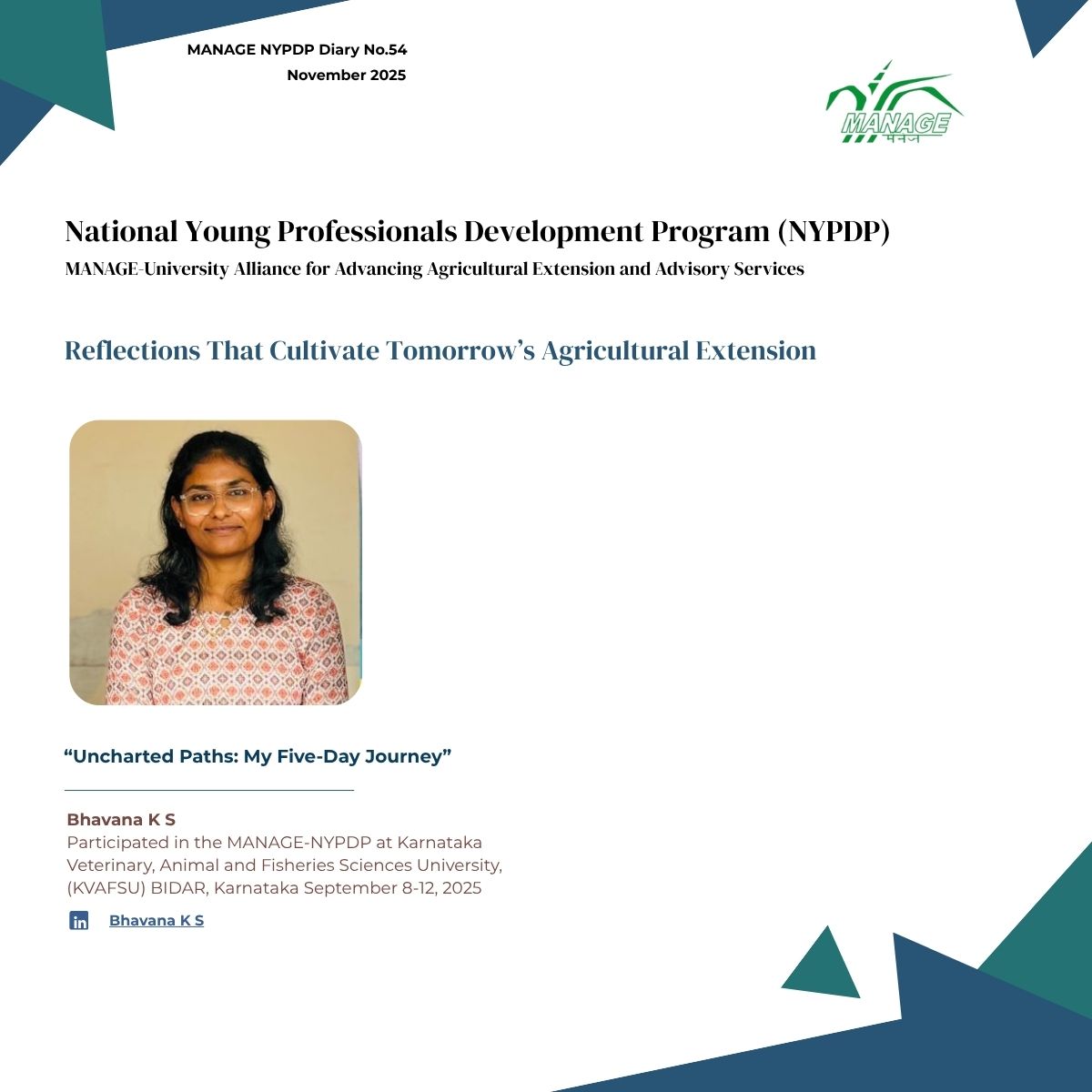 Saravanan, R., Raahalya, S., and Jeena, P. (Eds.). 2025. MANAGE NYPDP Diaries: Reflections That Cultivate Tomorrow’s Agricultural Extension (Vol. I). National Institute of Agricultural Extension Management (MANAGE), Hyderabad, India, 199p.