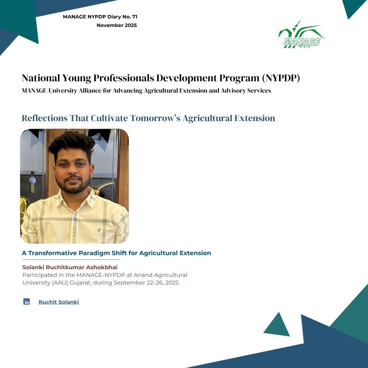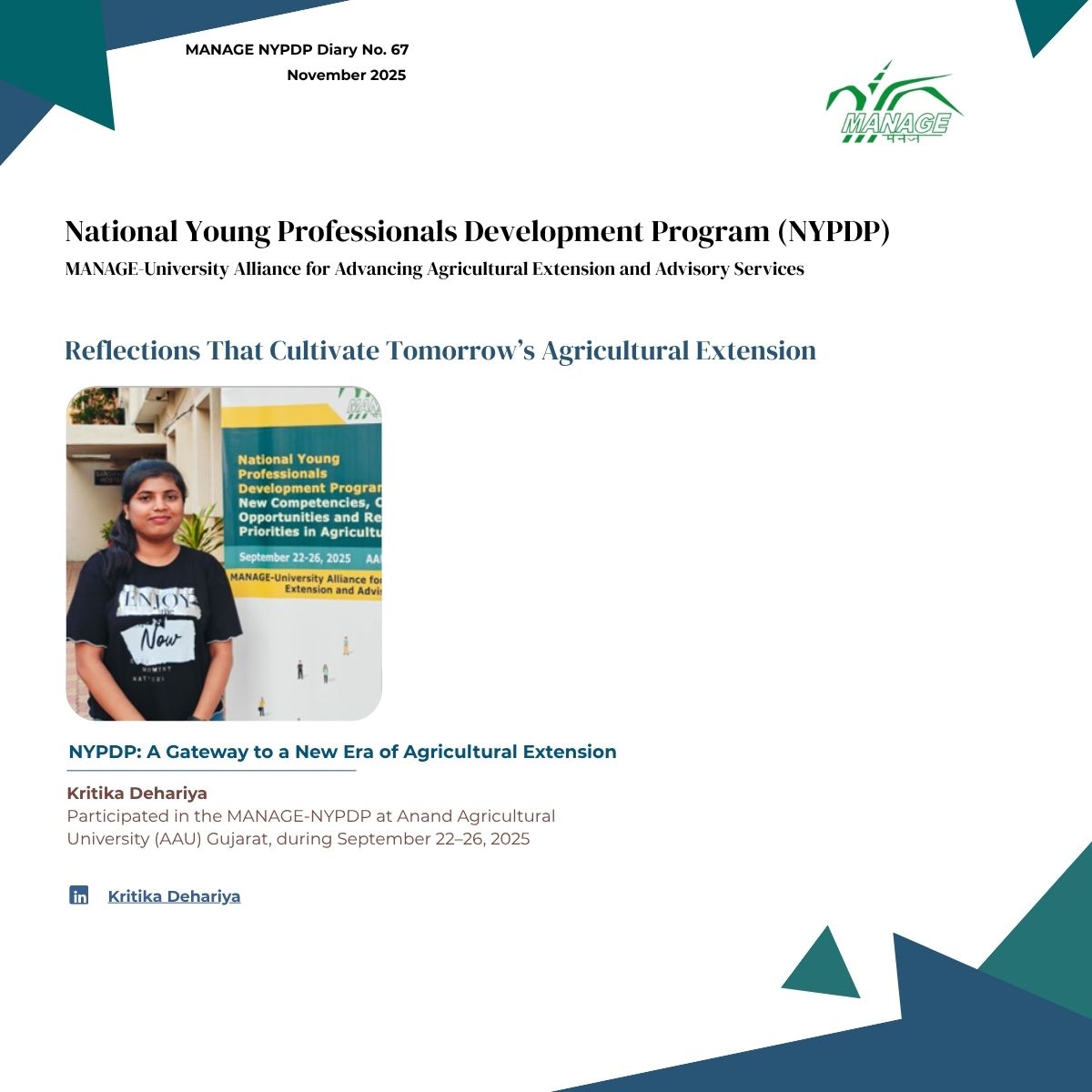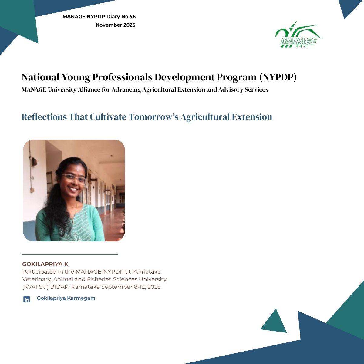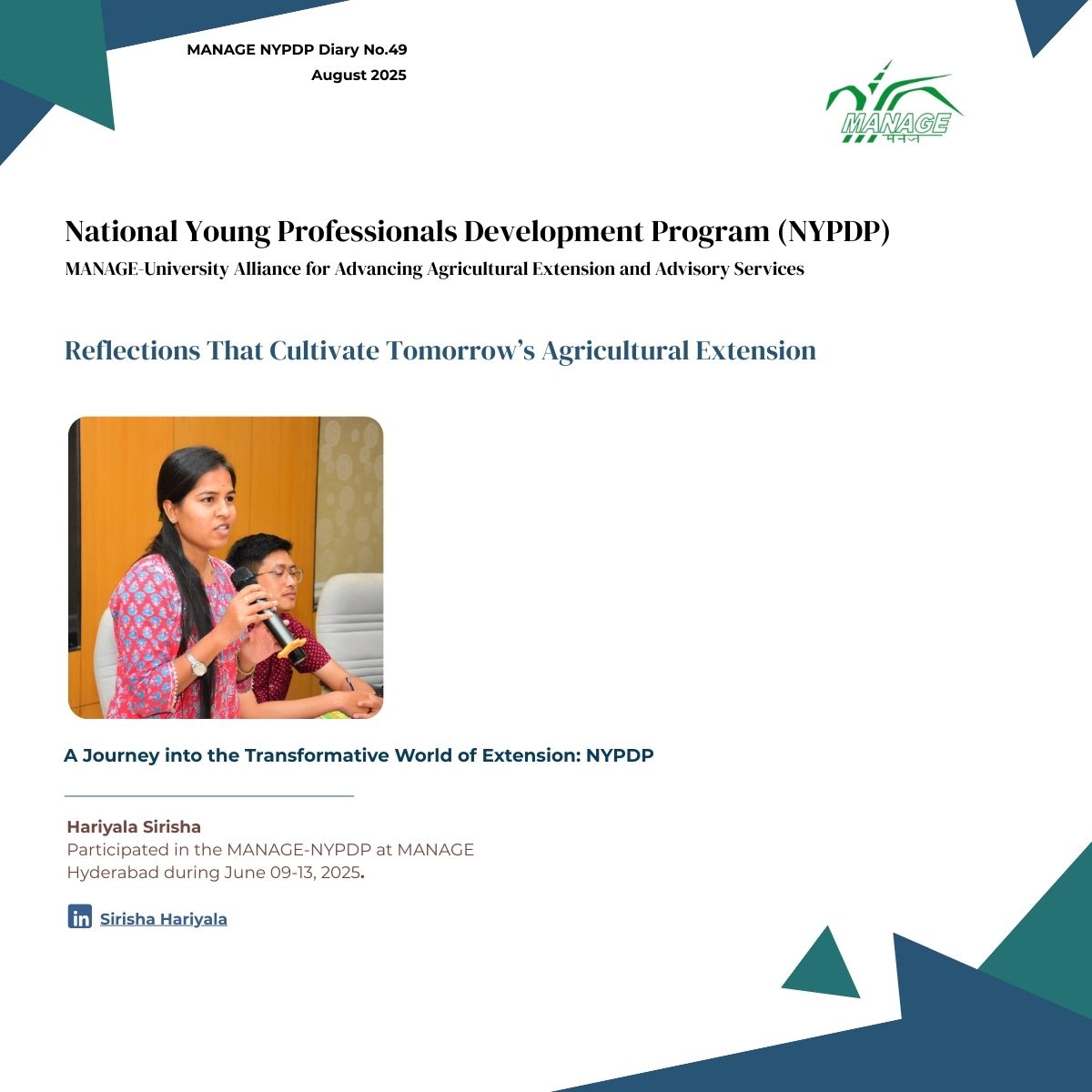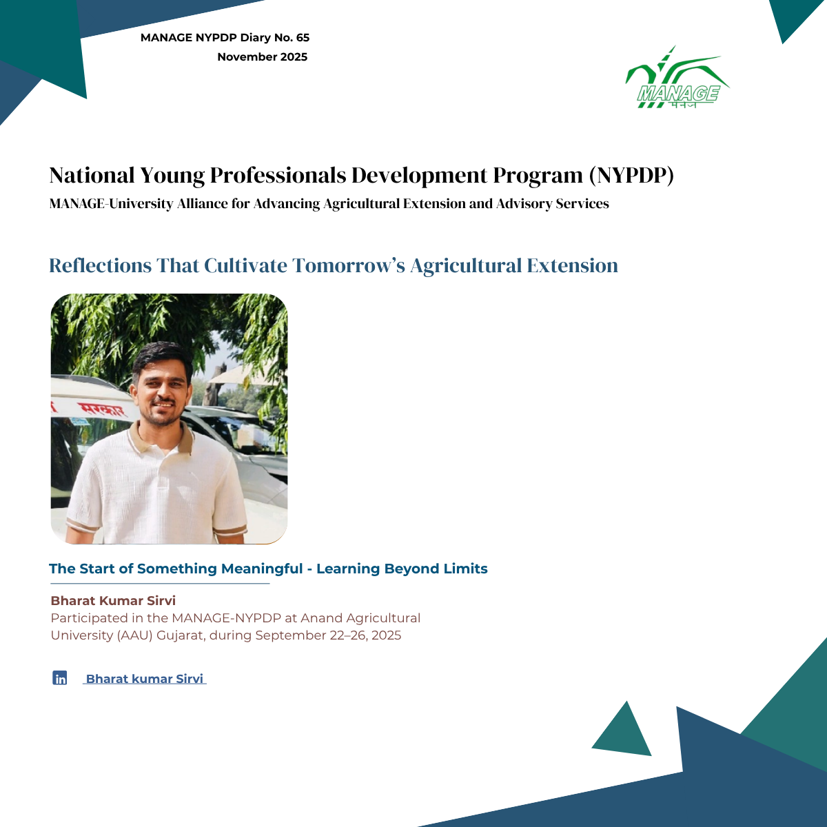Saravanan, R., Raahalya, S., and Jeena, P. (Eds.). 2025. MANAGE NYPDP Diaries: Reflections That Cultivate Tomorrow’s Agricultural Extension (Vol. I). National Institute of Agricultural Extension Management (MANAGE), Hyderabad, India, 199p.