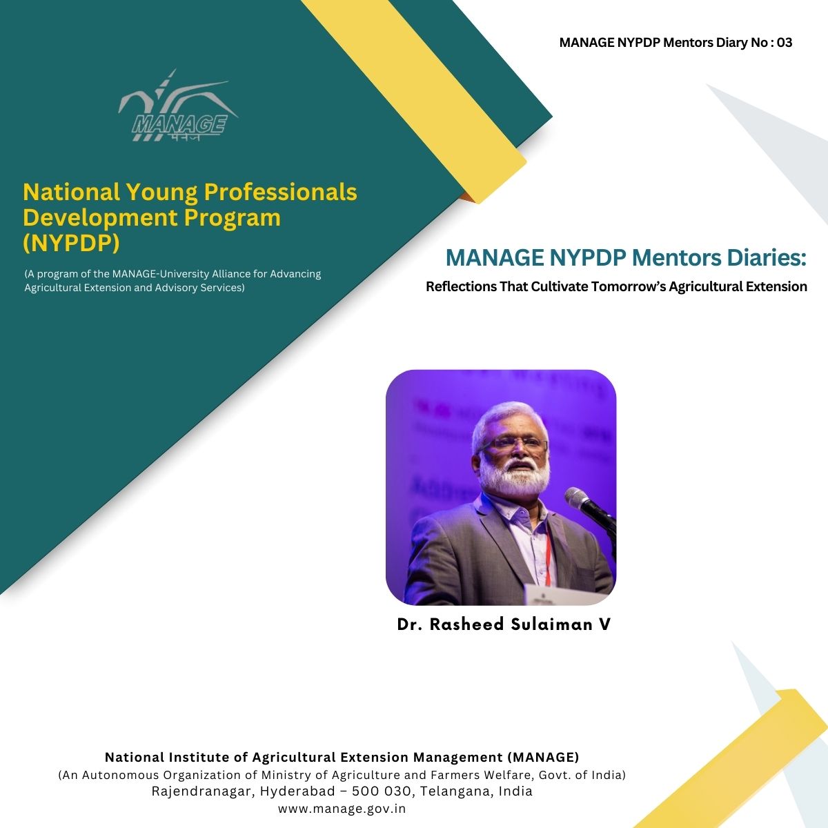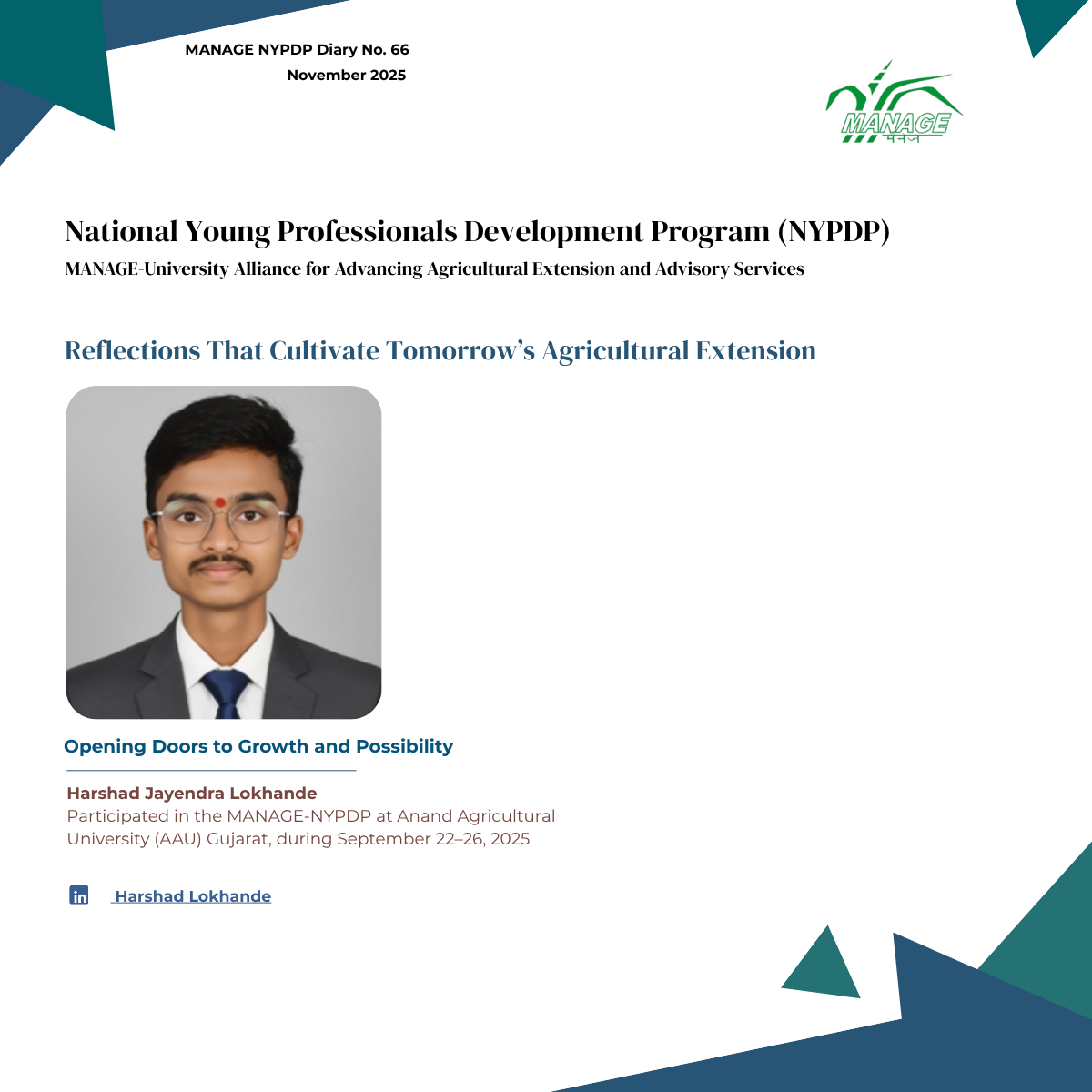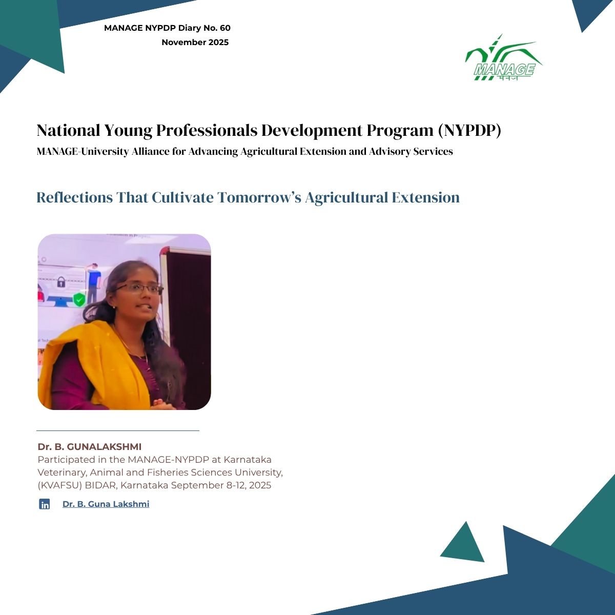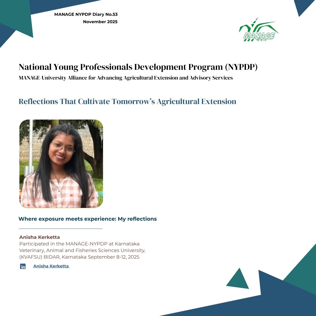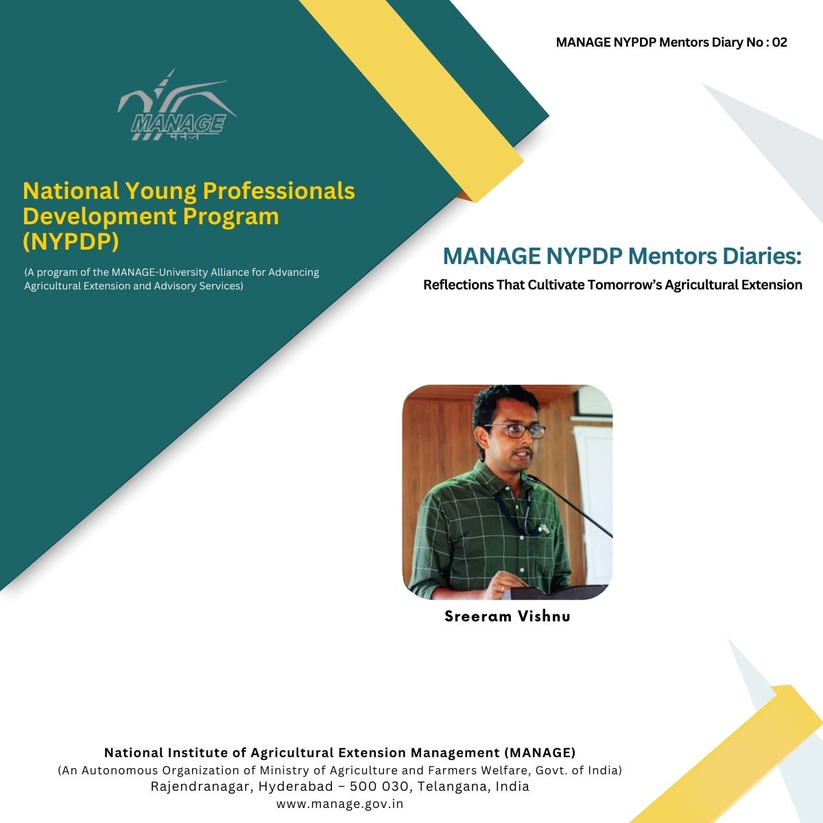 Saravanan, R., Raahalya, S., and Jeena, P. (Eds.). 2025. MANAGE NYPDP Diaries: Reflections That Cultivate Tomorrow’s Agricultural Extension (Vol. I). National Institute of Agricultural Extension Management (MANAGE), Hyderabad, India, 199p.