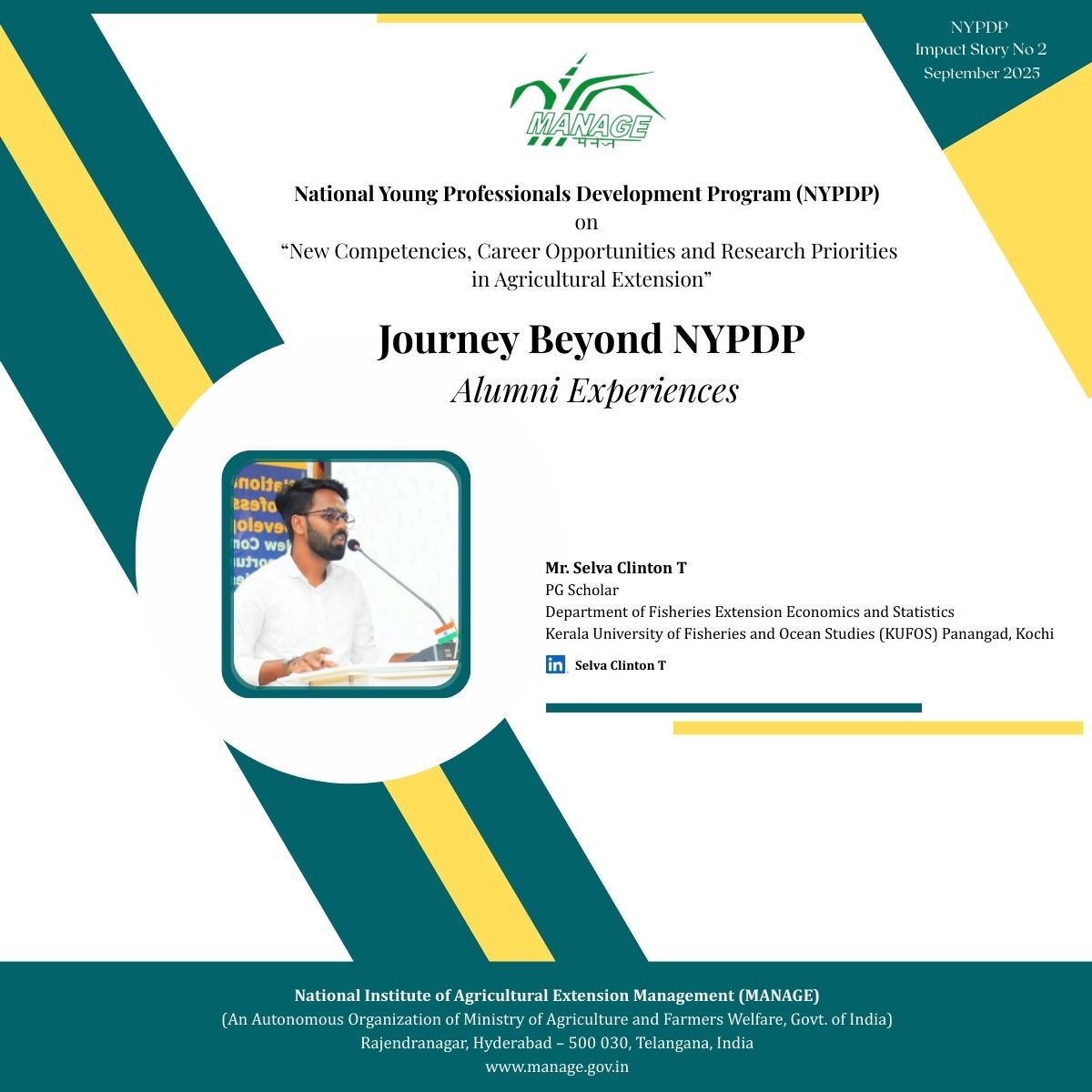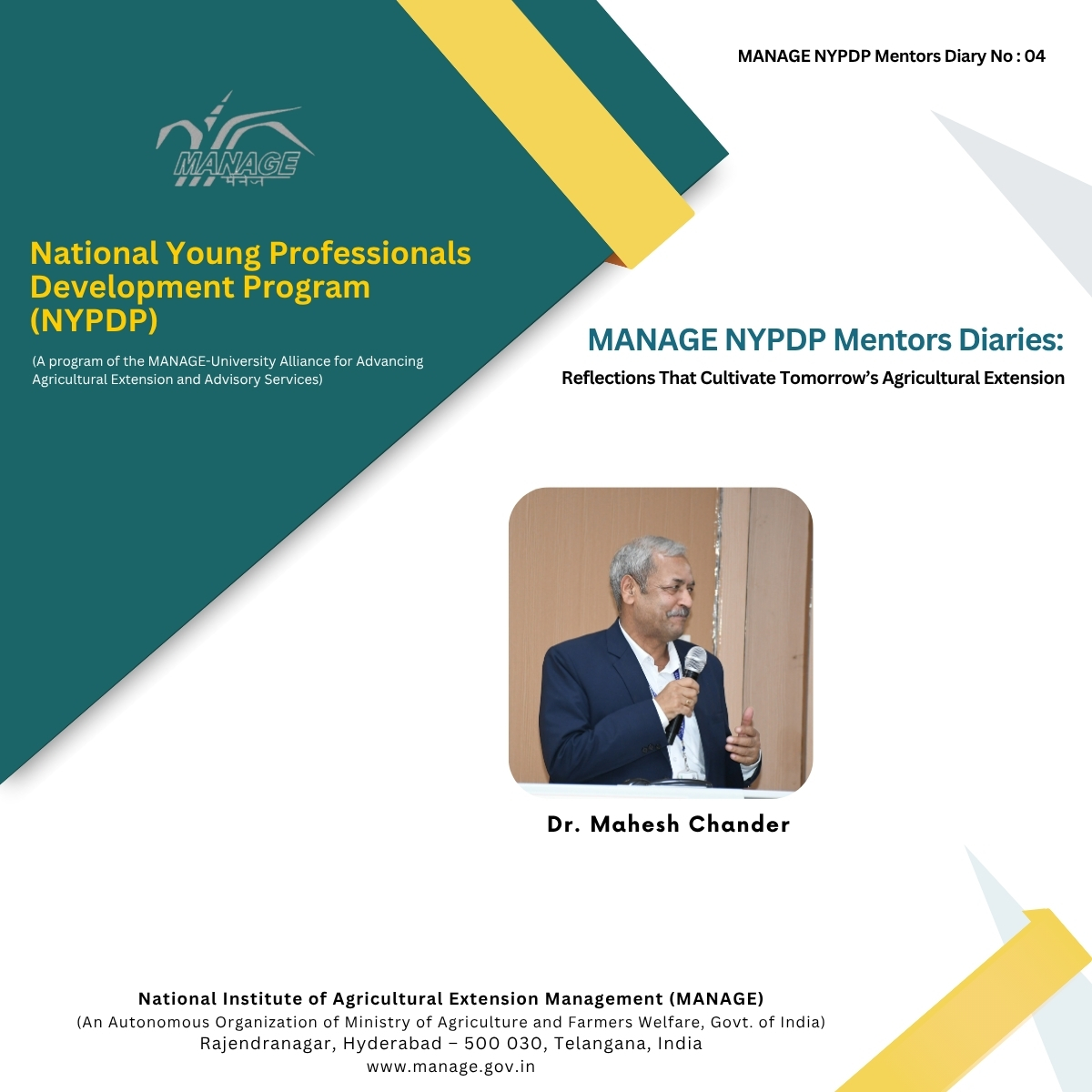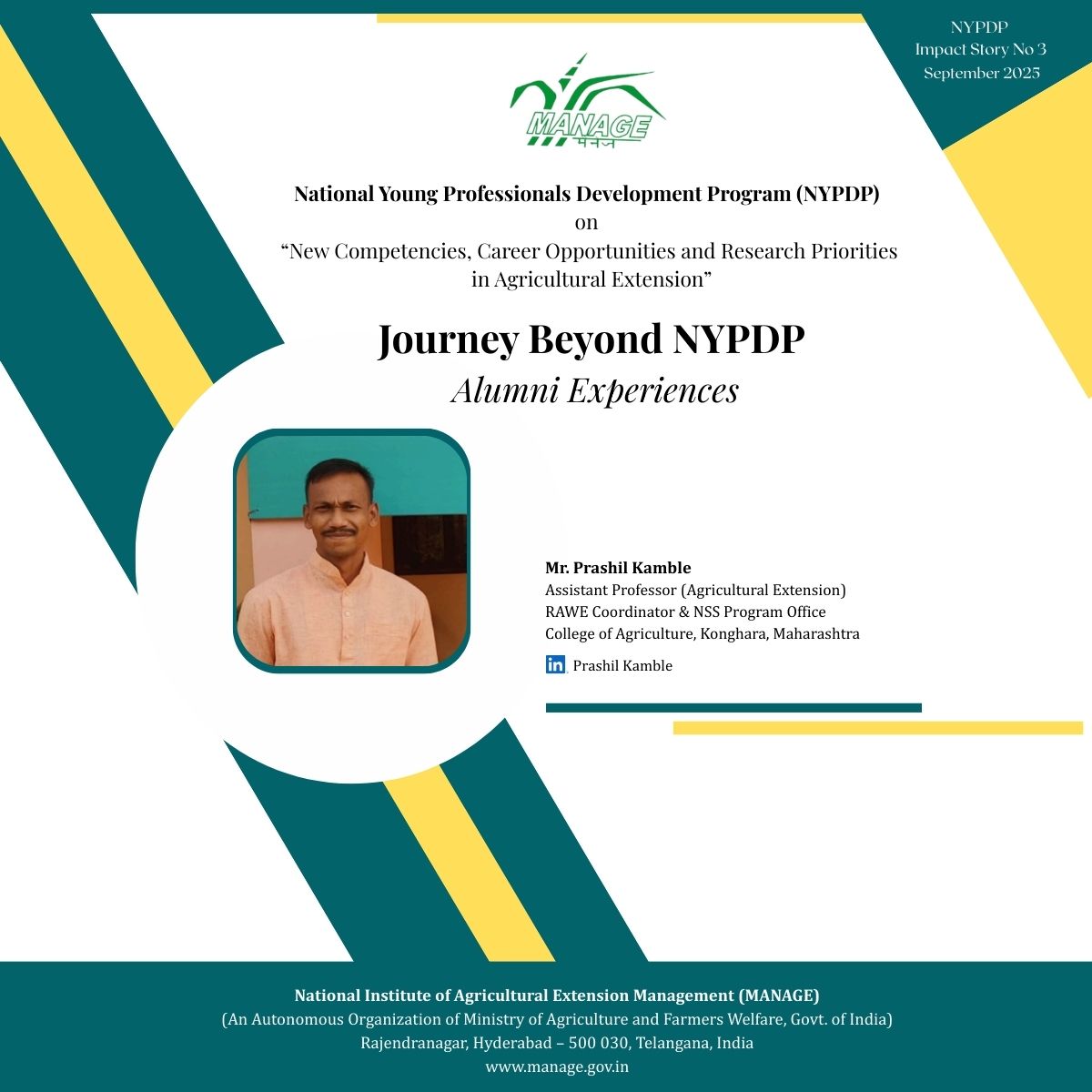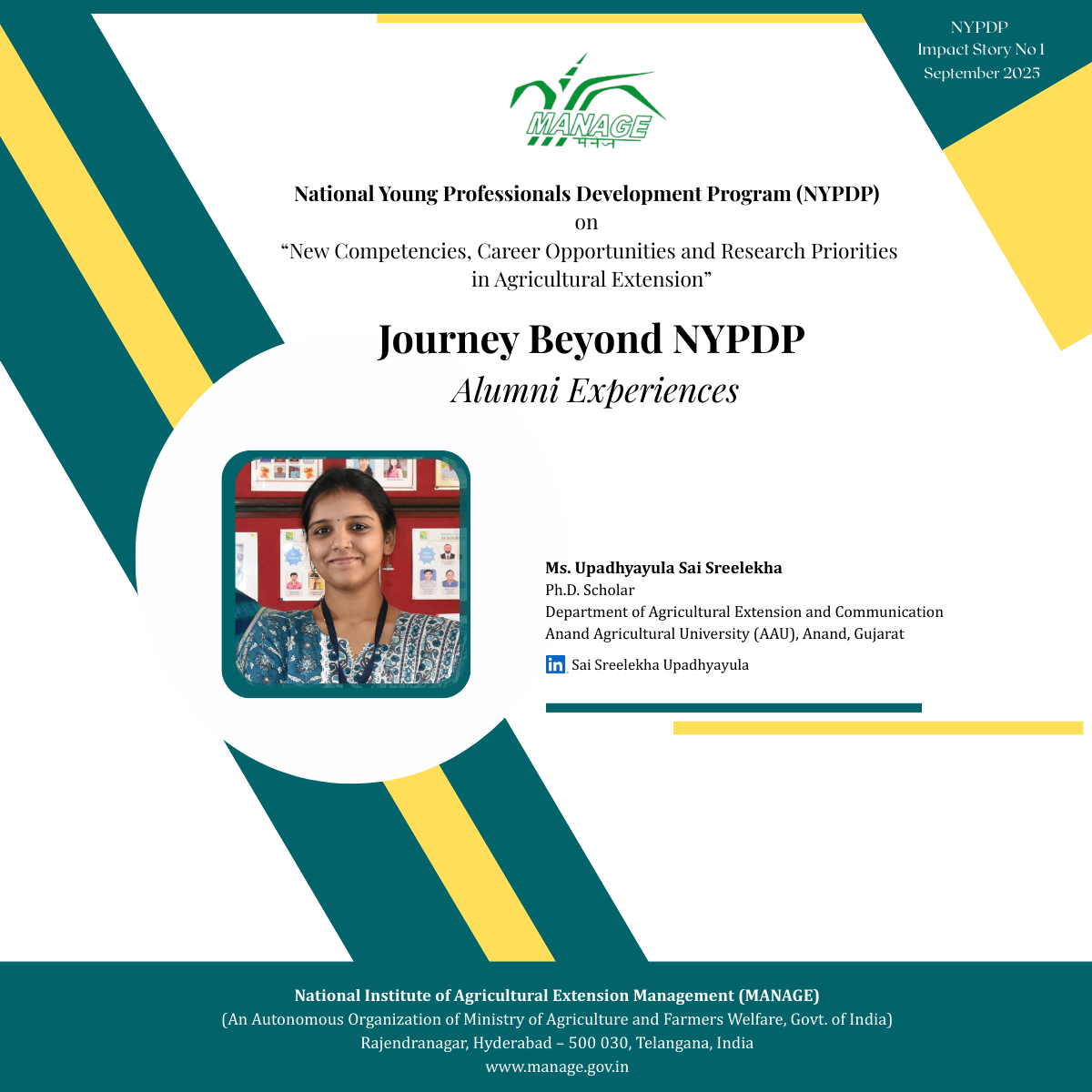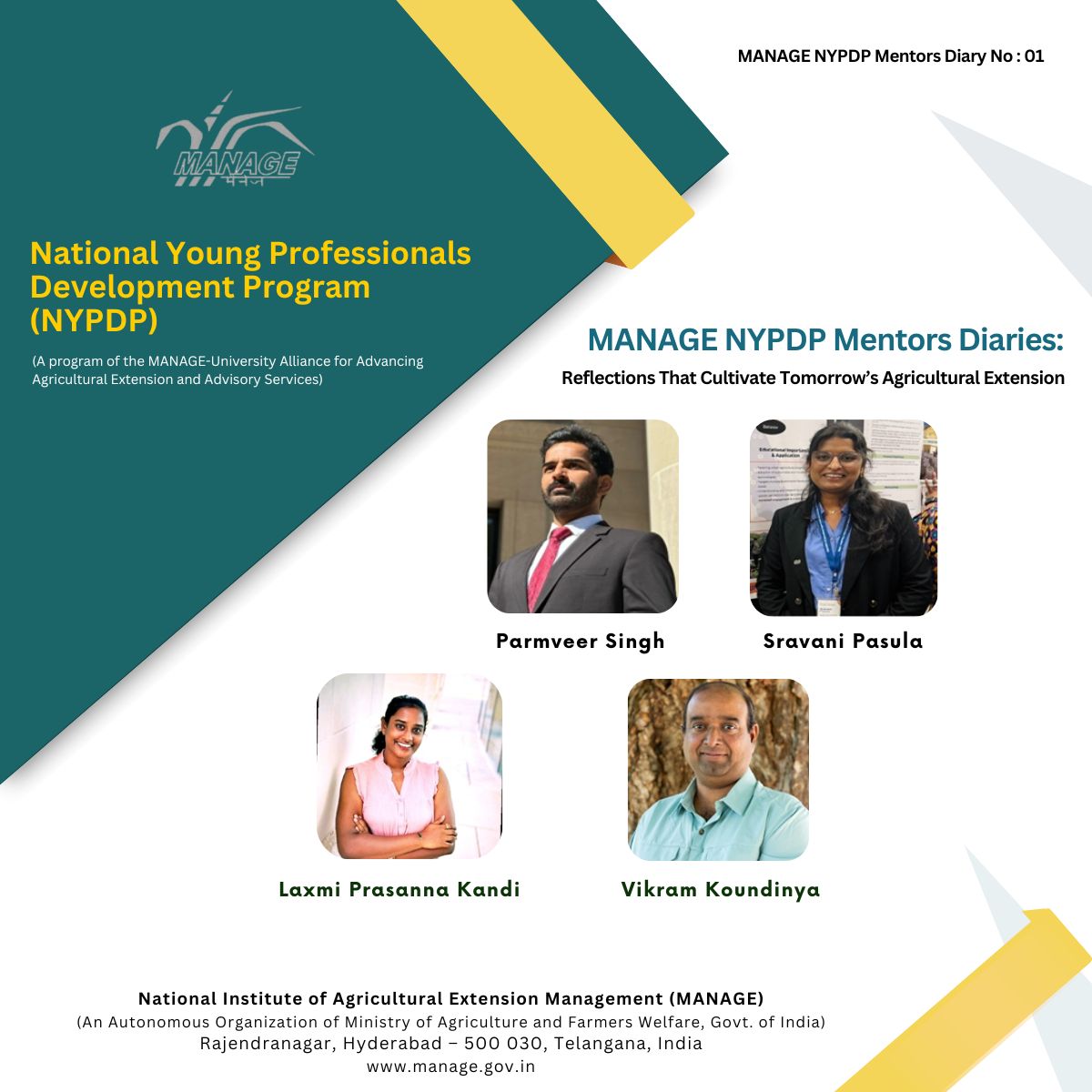 Saravanan, R., Raahalya, S., and Jeena, P. (Eds.). 2025. MANAGE NYPDP Diaries: Reflections That Cultivate Tomorrow’s Agricultural Extension (Vol. I). National Institute of Agricultural Extension Management (MANAGE), Hyderabad, India, 199p.