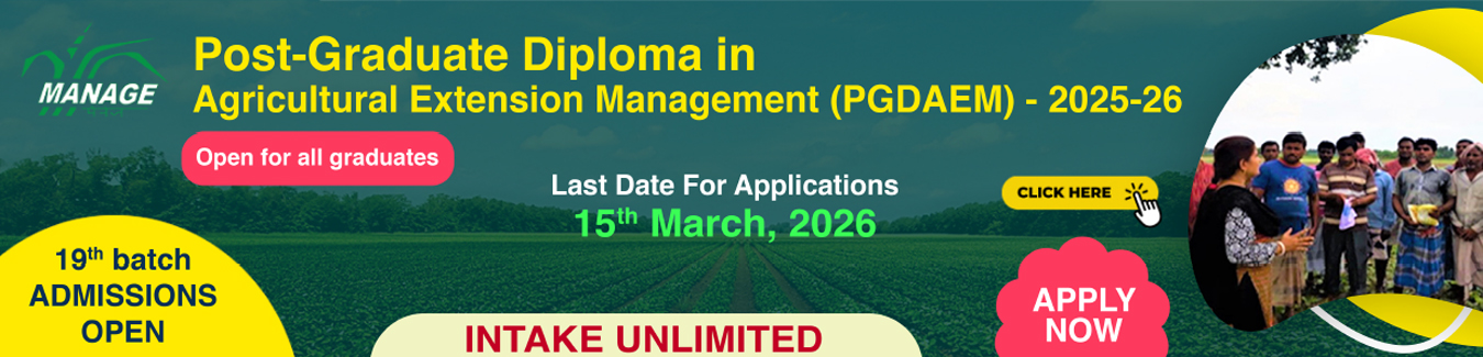 17 | MANAGE Dialogue 2026 : International Workshop on the Future of Agricultural Extension and Advisory Services...Register Now | 24/02/2026-26/02/2026 | Dr. Saravanan Raj | On-Campus, MANAGE |