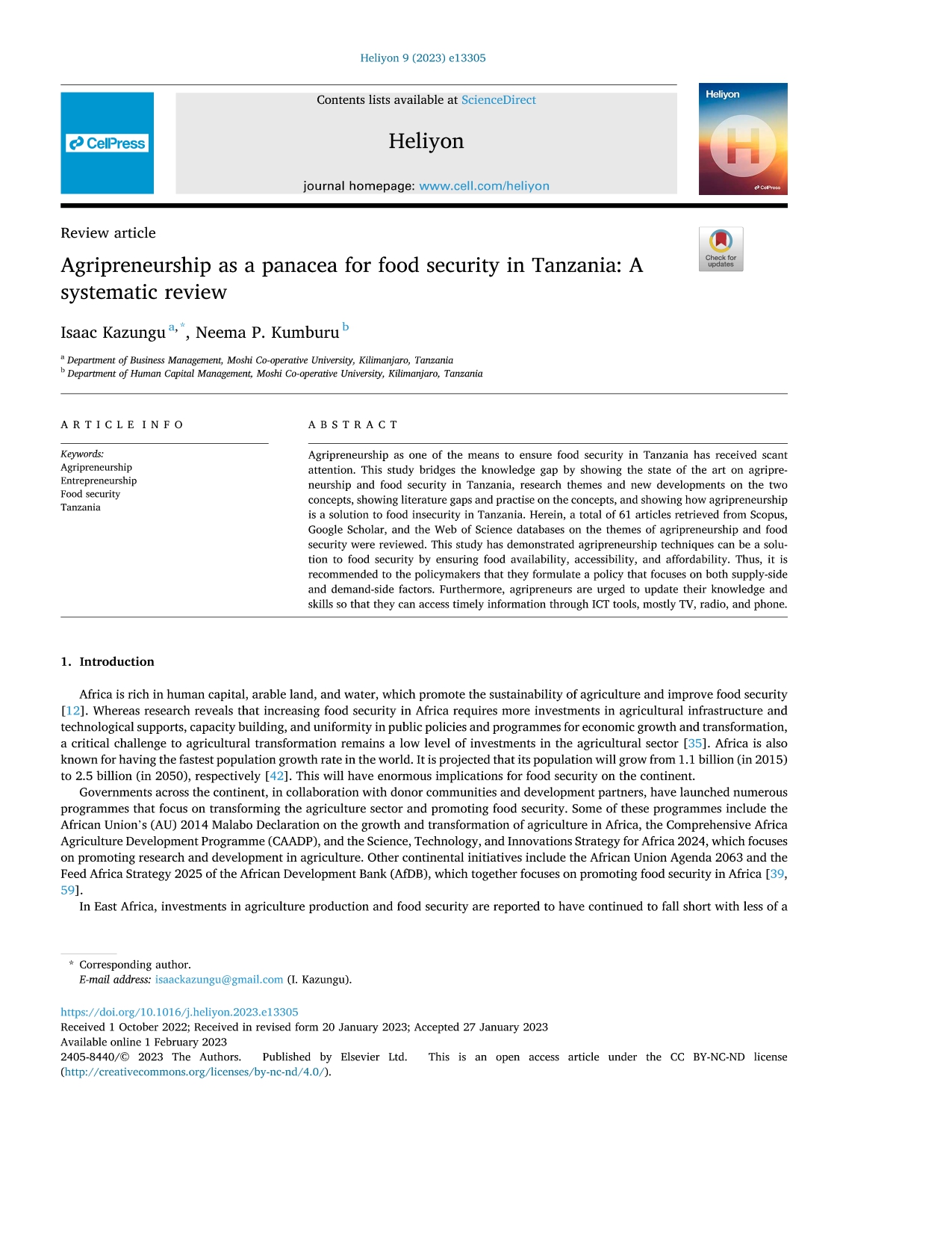 Research Article - 11 : Agripreneurship as a Panacea for Food Security in Tanzania