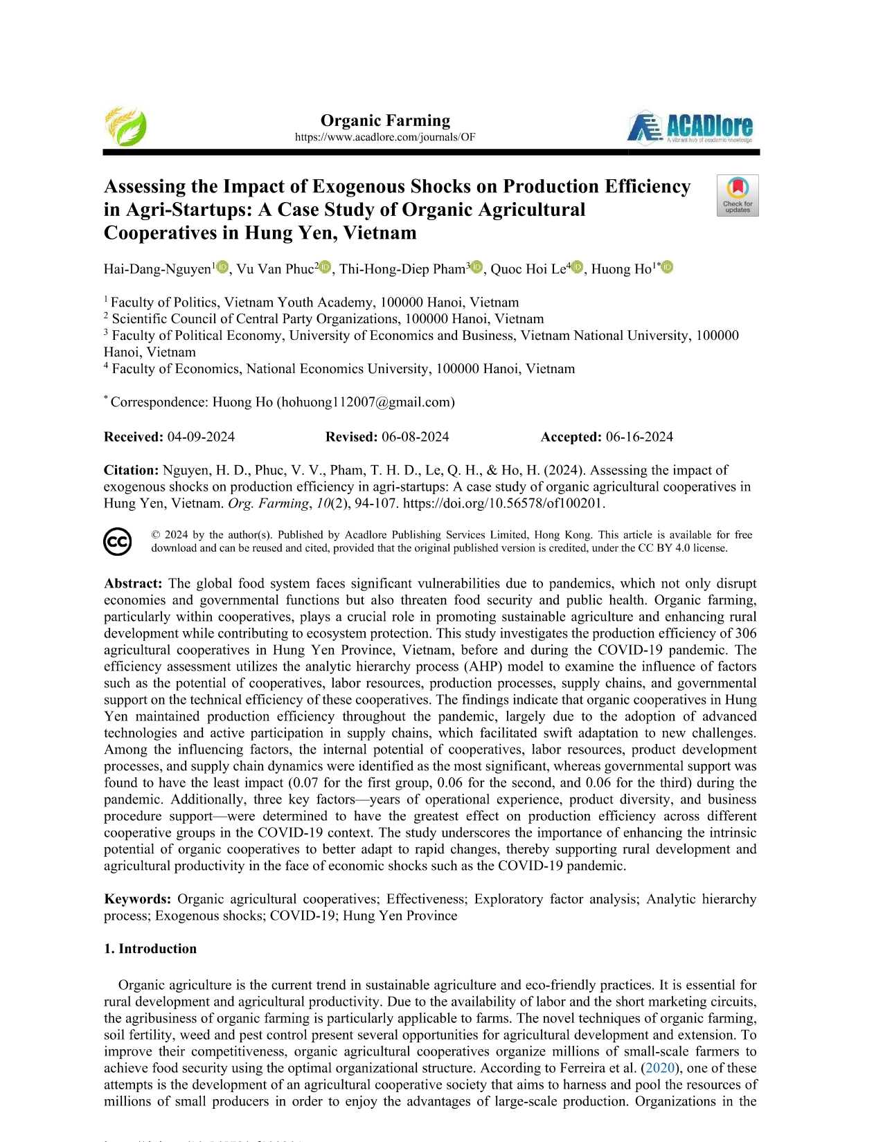 Research Article - 14 :Assessing the Exogenous Shocks in Agri-Startups: A Case Study of Agricultural Cooperatives in Hung Yen, Vietnam