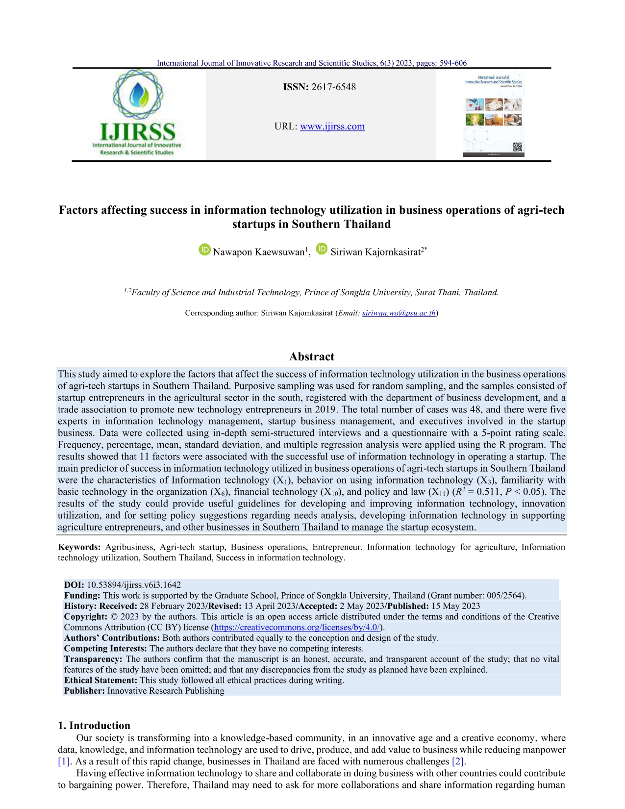 Research Article - 15 : Factors affecting success in information technology utilization in business of agri-tech startups in Southern Thailand