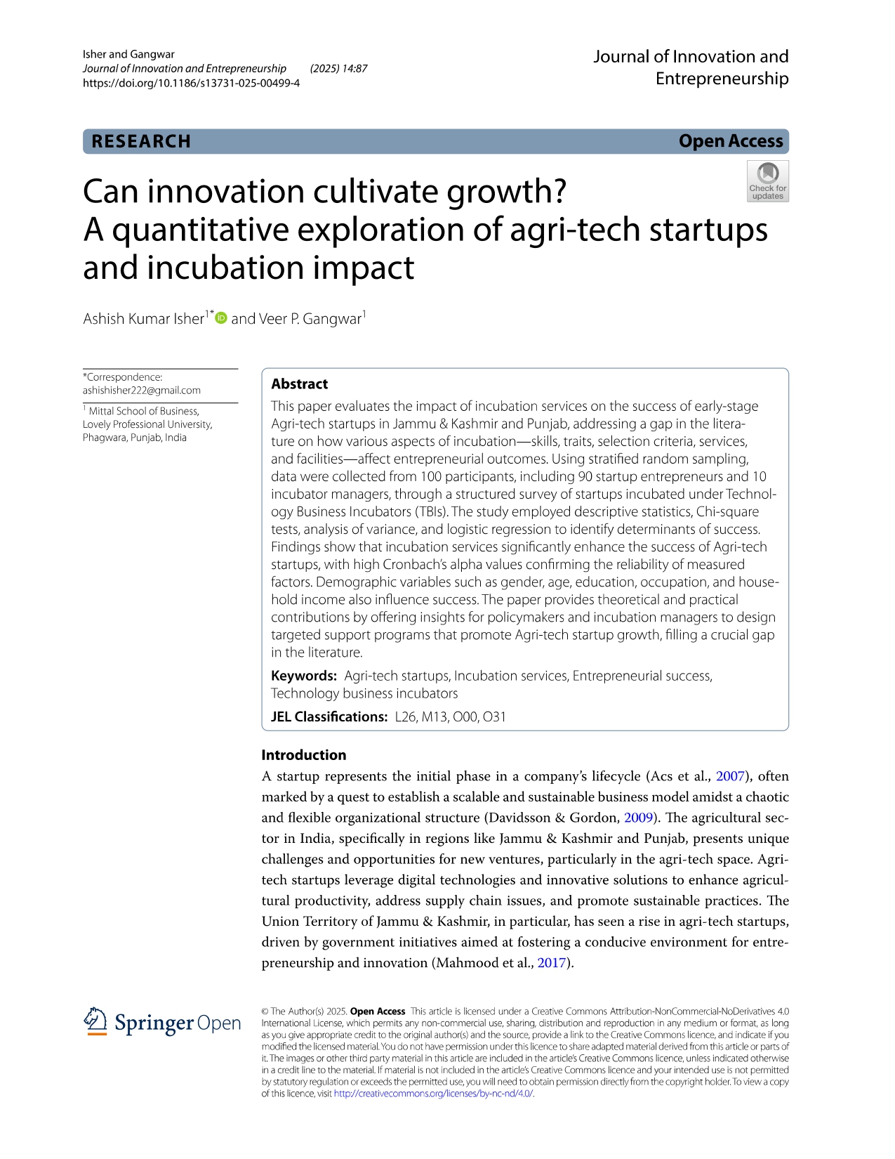Research Article - 16 : Can innovation cultivate growth? A quantitative exploration of agri-tech startups and incubation impact