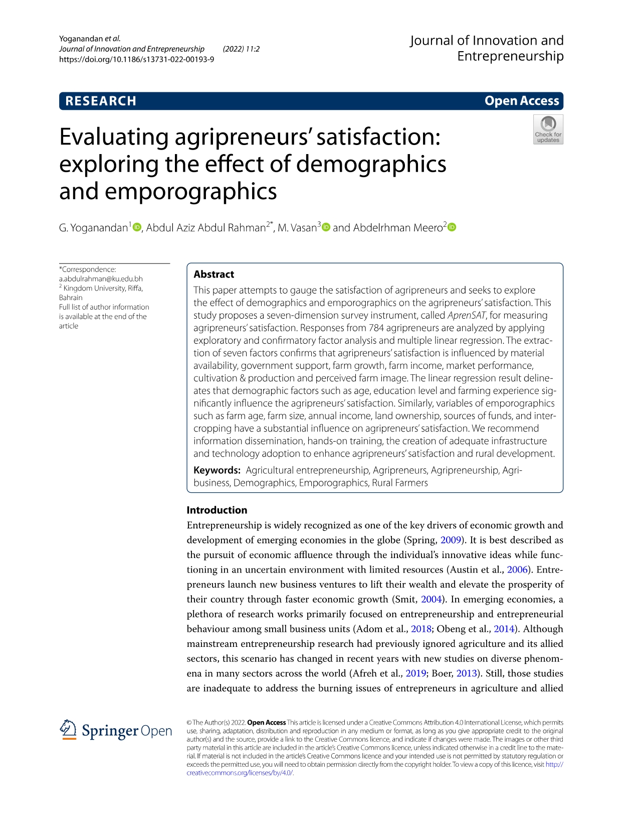 Research Article - 18 : Evaluating agripreneurs’ satisfaction: exploring the effect of demographics and emporographics