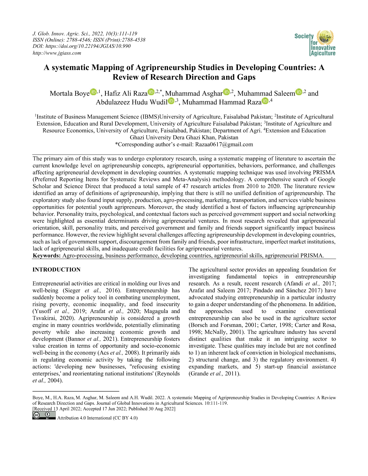 Research Article - 19 : A systematic Mapping of Agripreneurship Studies in Developing Countries: A Review of Research Direction and Gaps