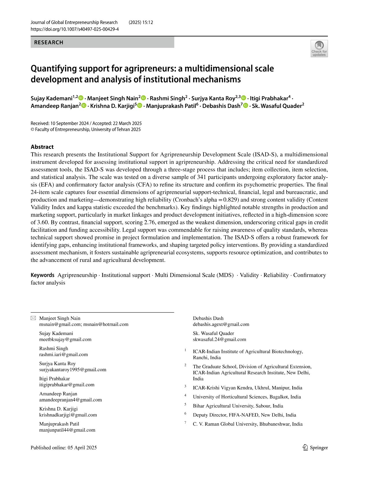 Research Article - 20 : Quantifying support for agripreneurs: a multidimensional scale development and analysis of institutional mechanisms