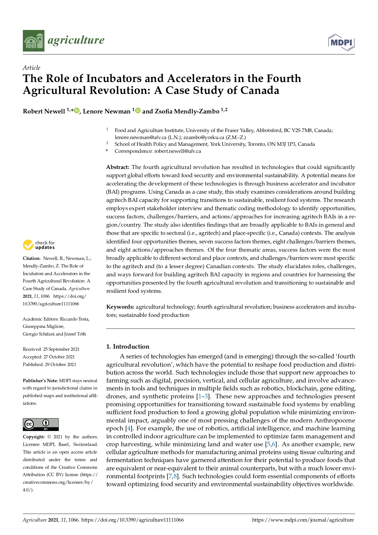 Research Article - 24 : The Role of Incubators and Accelerators in the Fourth Agricultural Revolution: A Case Study of Canada