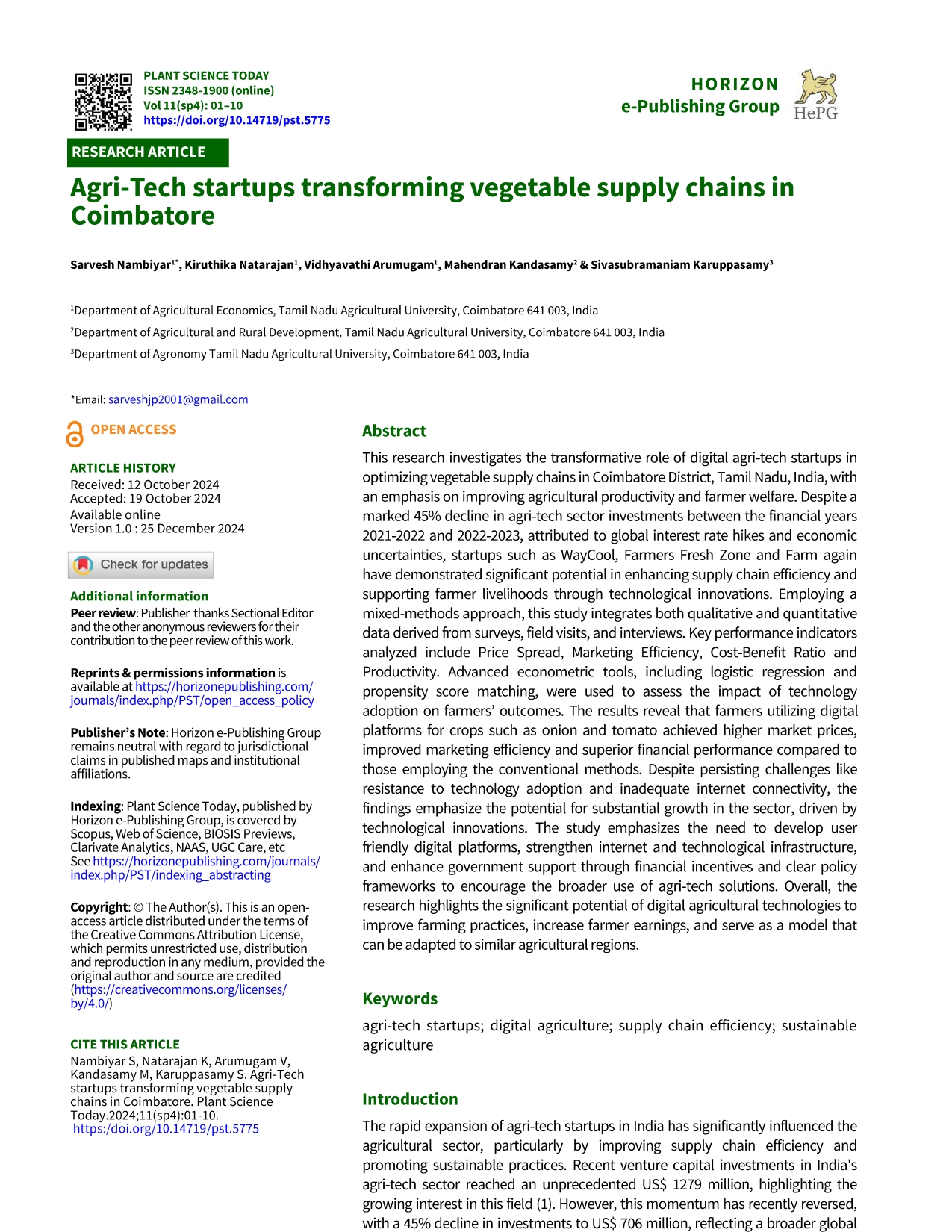 Research Article - 6 : Agri-Tech startups transforming vegetable supply chains in Coimbatore