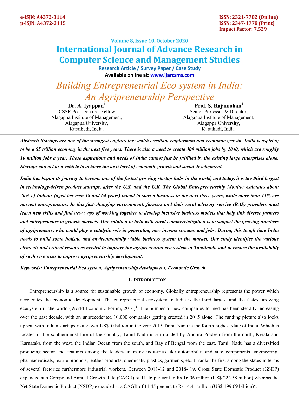 Research Article - 7 : Building Entrepreneurial Eco system in India: An Agripreneurship Perspective