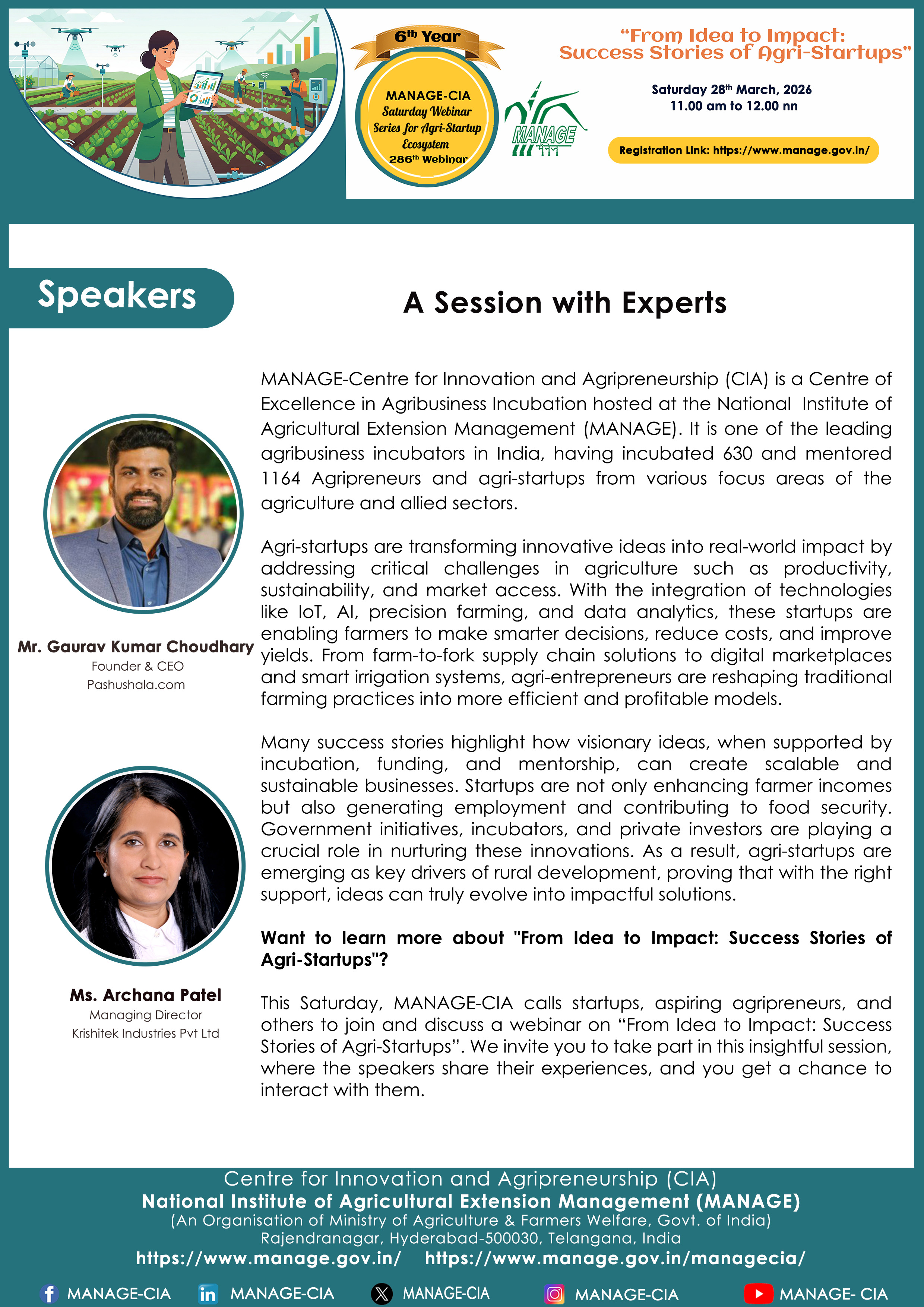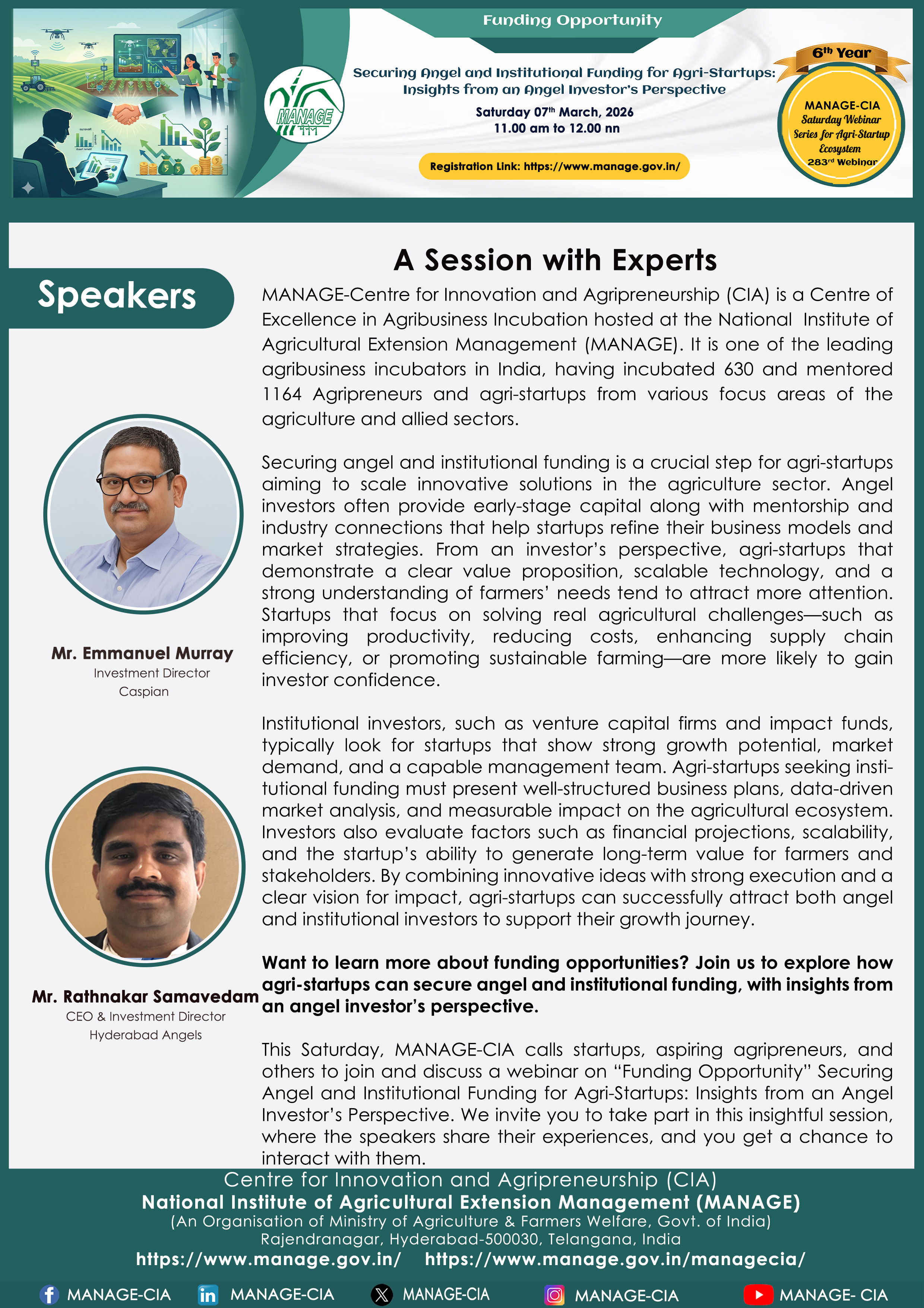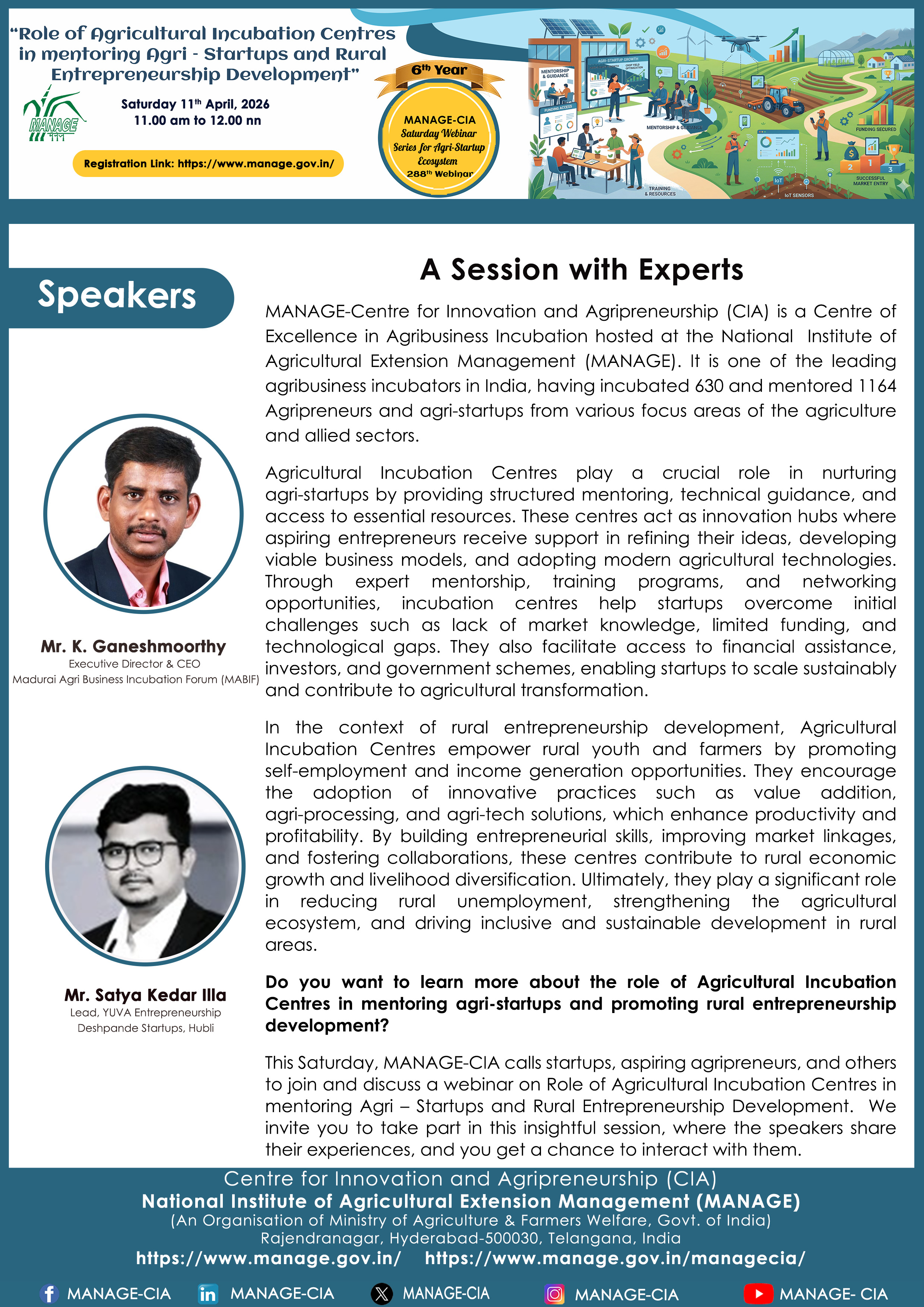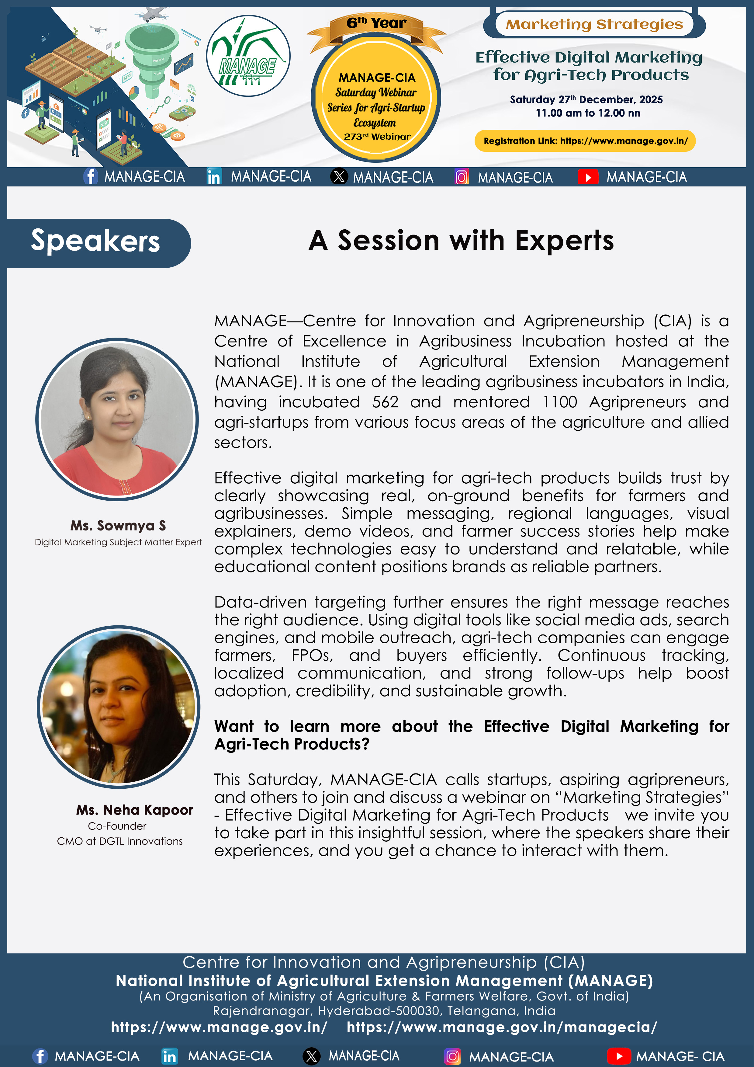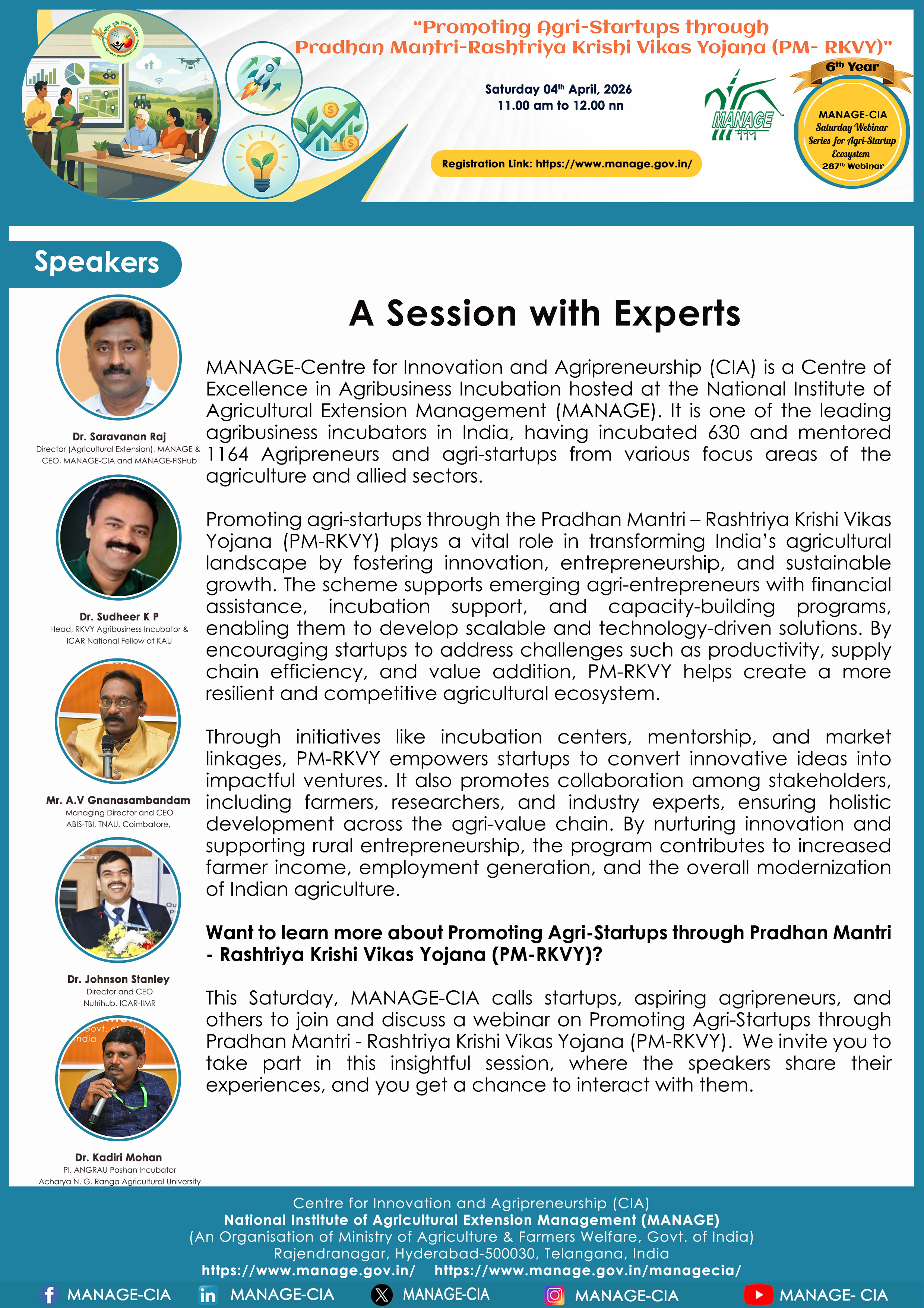 National Institute of Agricultural Extension Management (MANAGE) - Centre for Innovation and Agripreneurship (CIA), has launched “Saturday Webinar Series” to address various important topics relevant to Agri-Startup Eco-System and to create awareness among the Agri-Startups, Agri Entrepreneurs, Faculties, Scholars and Students, across India. Webinars are being conducted every Saturday 11 AM – 1 PM IST.