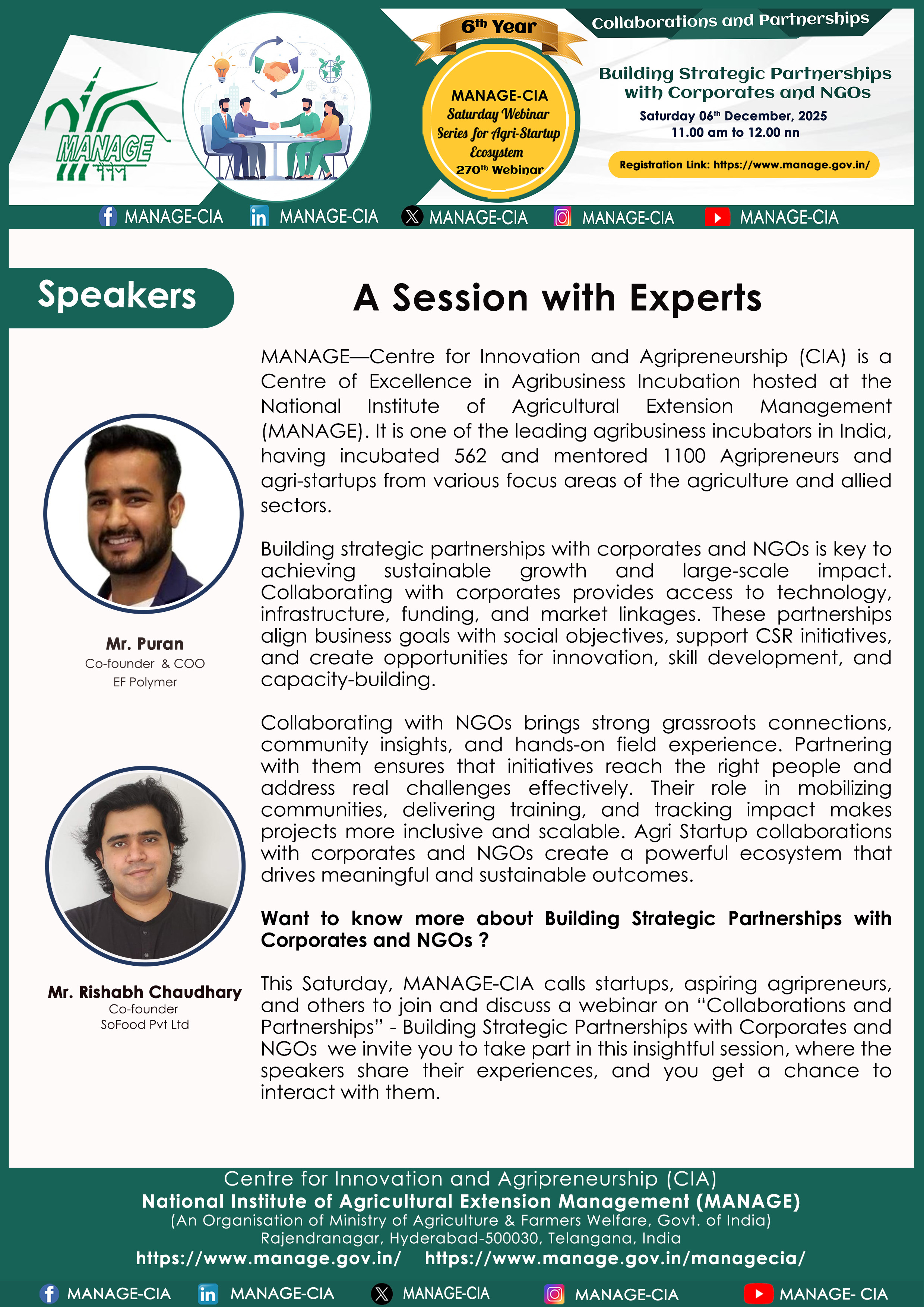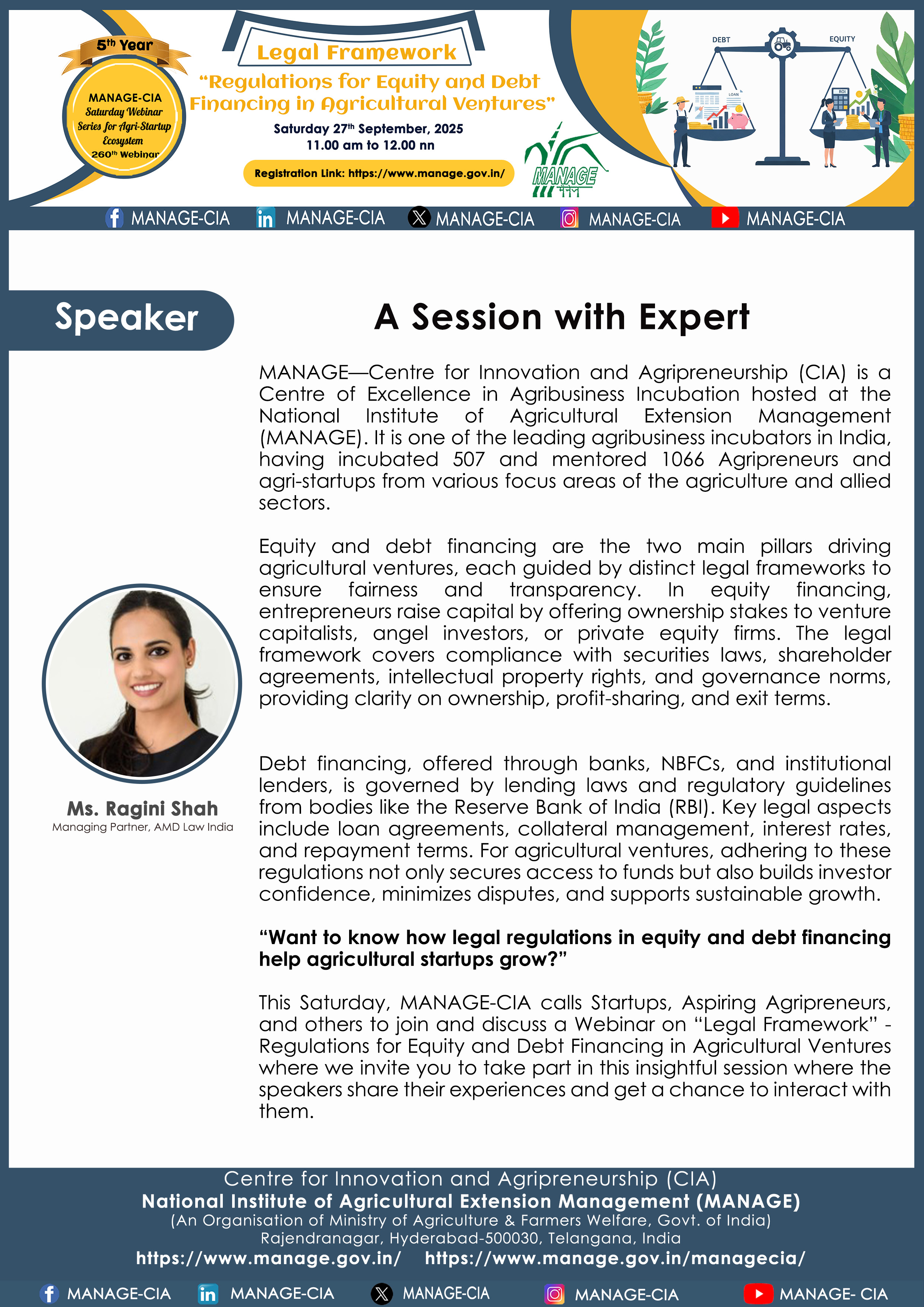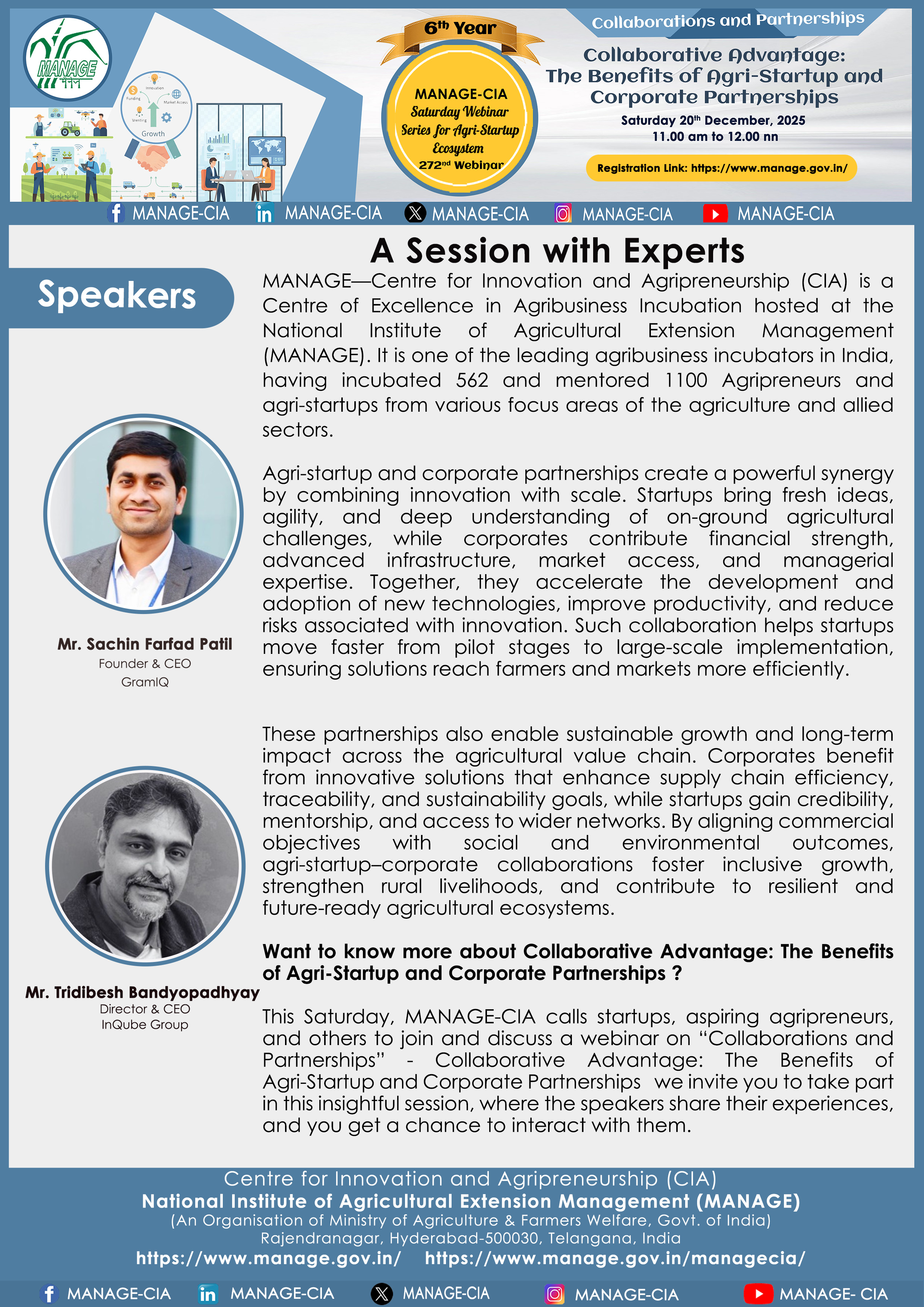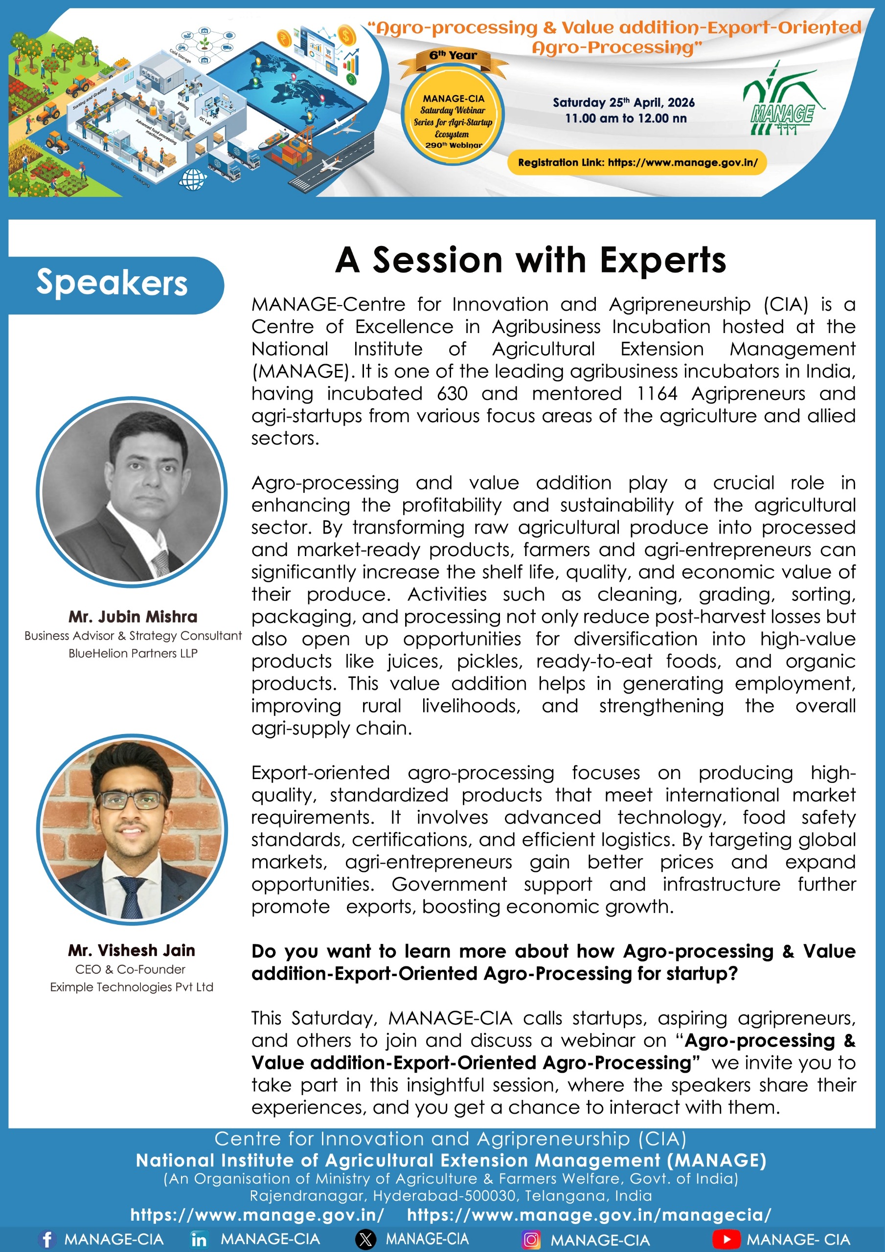 National Institute of Agricultural Extension Management (MANAGE) - Centre for Innovation and Agripreneurship (CIA), has launched “Saturday Webinar Series” to address various important topics relevant to Agri-Startup Eco-System and to create awareness among the Agri-Startups, Agri Entrepreneurs, Faculties, Scholars and Students, across India. Webinars are being conducted every Saturday 11 AM – 1 PM IST.