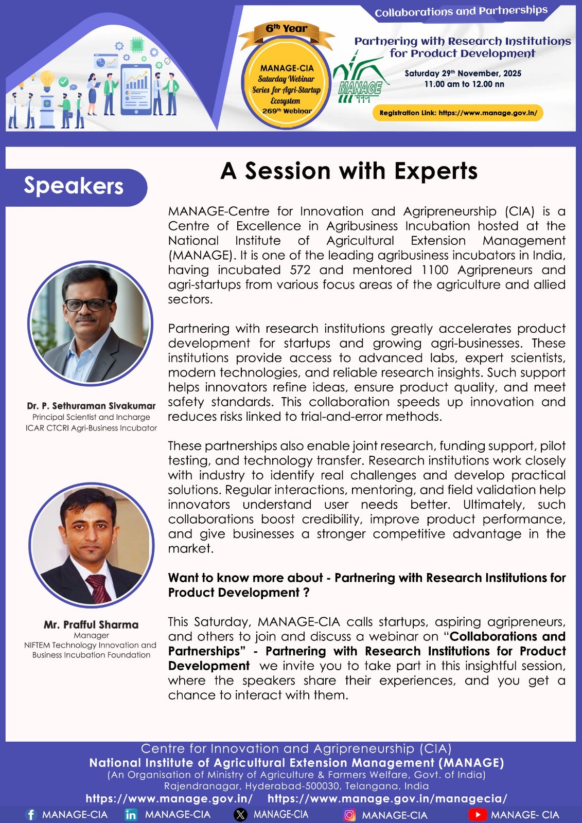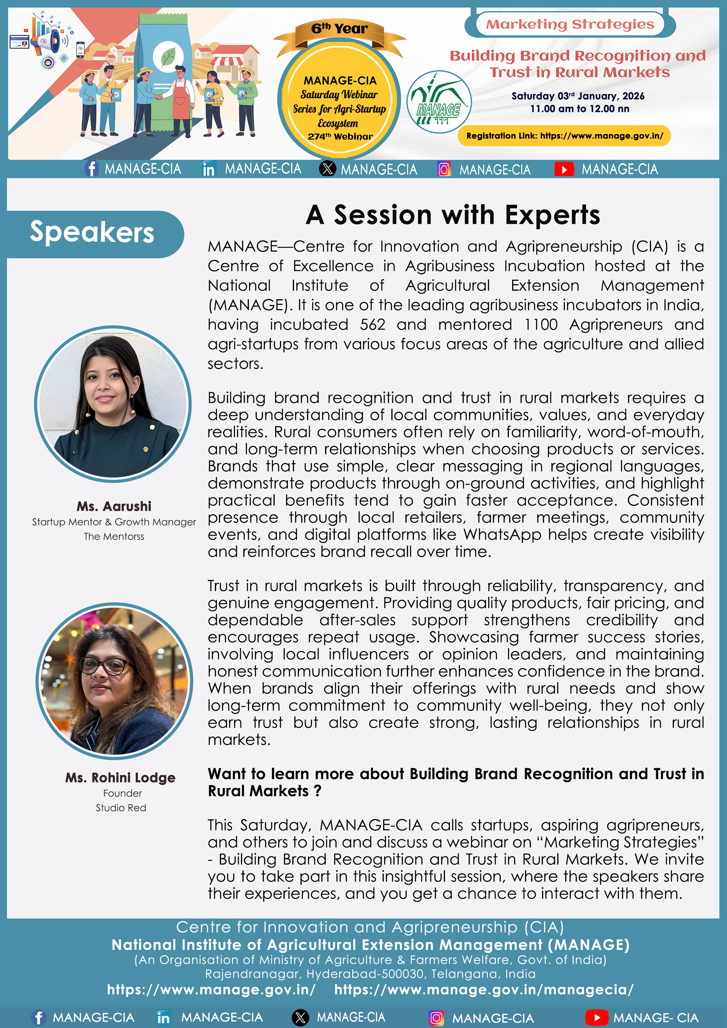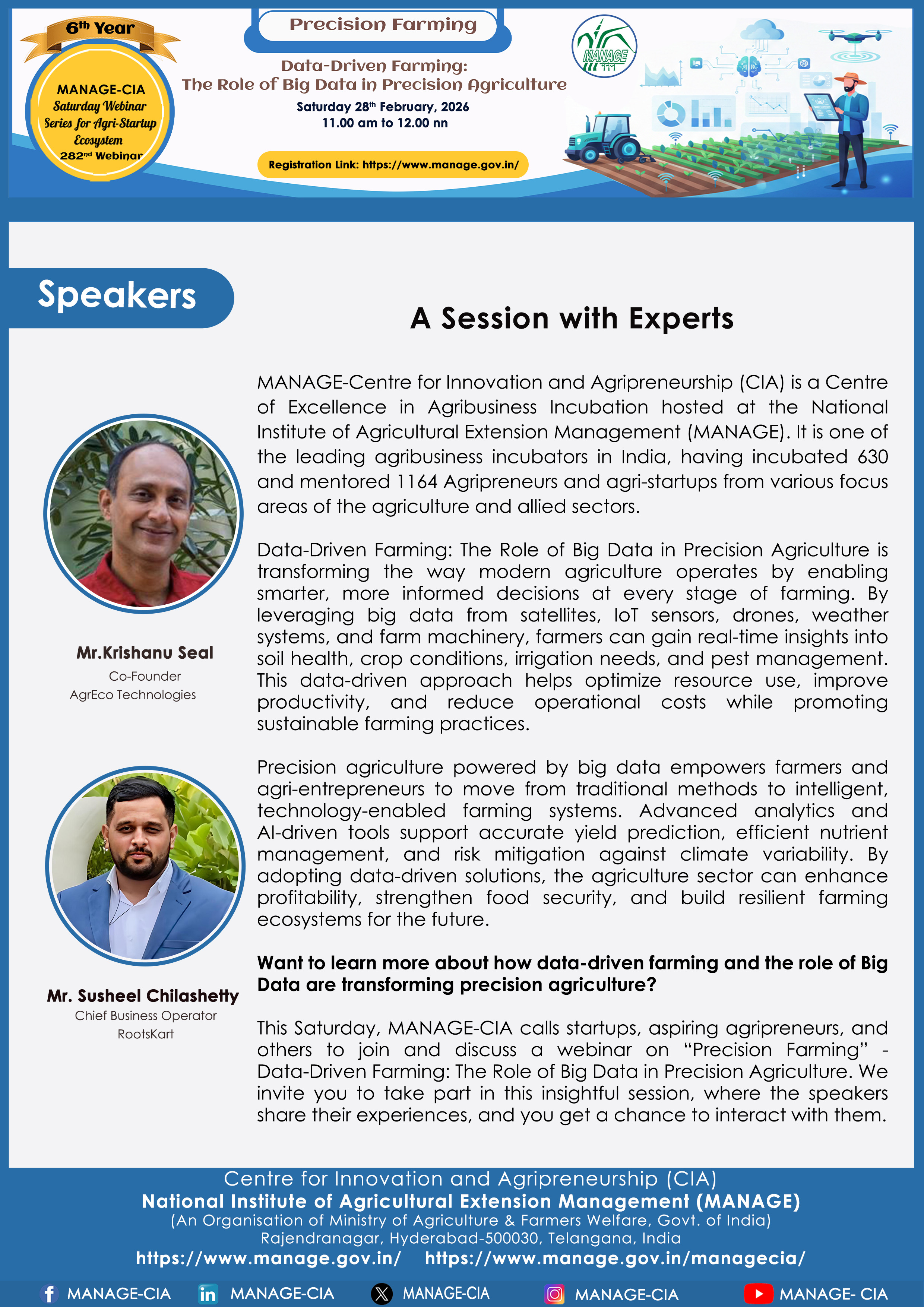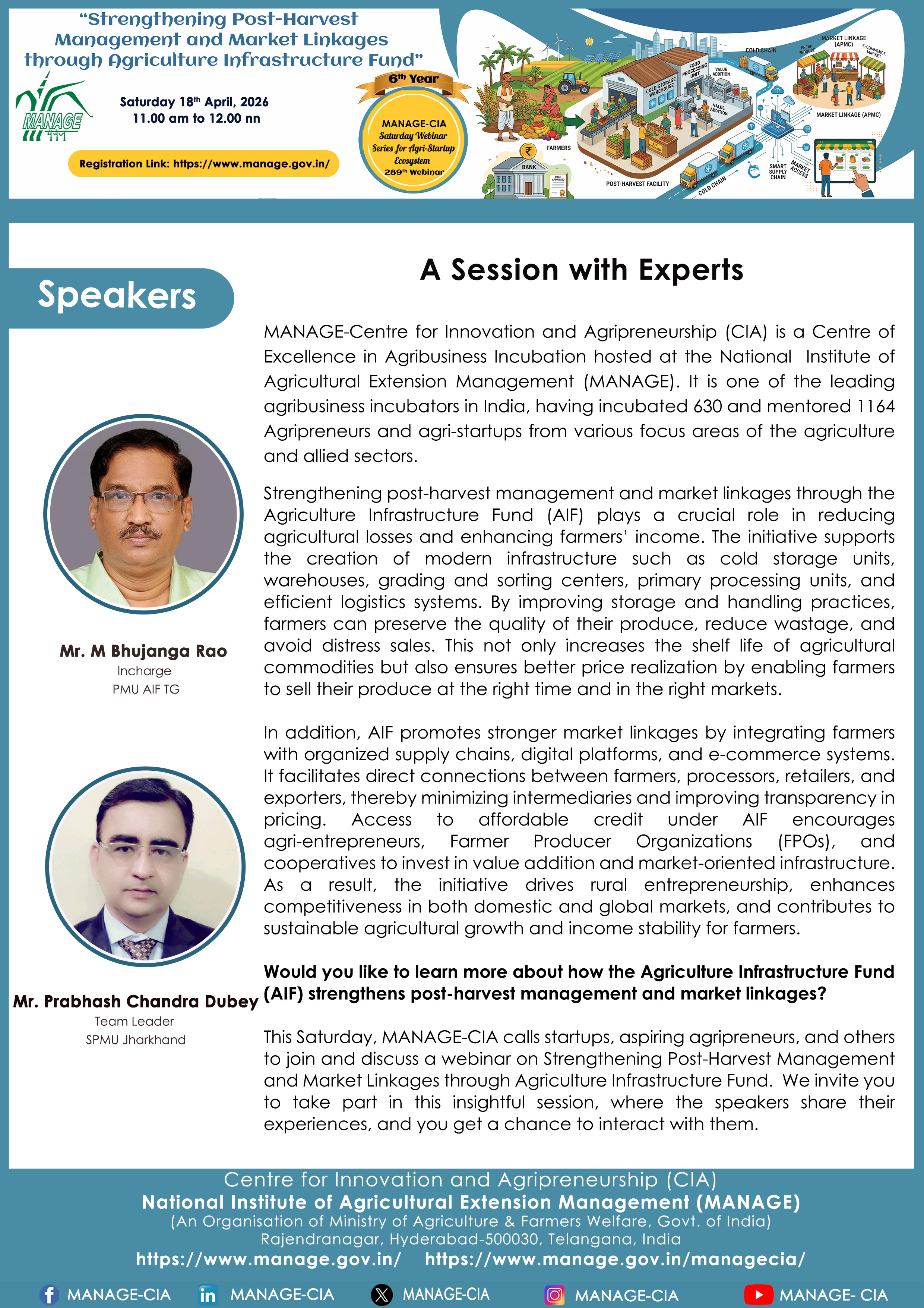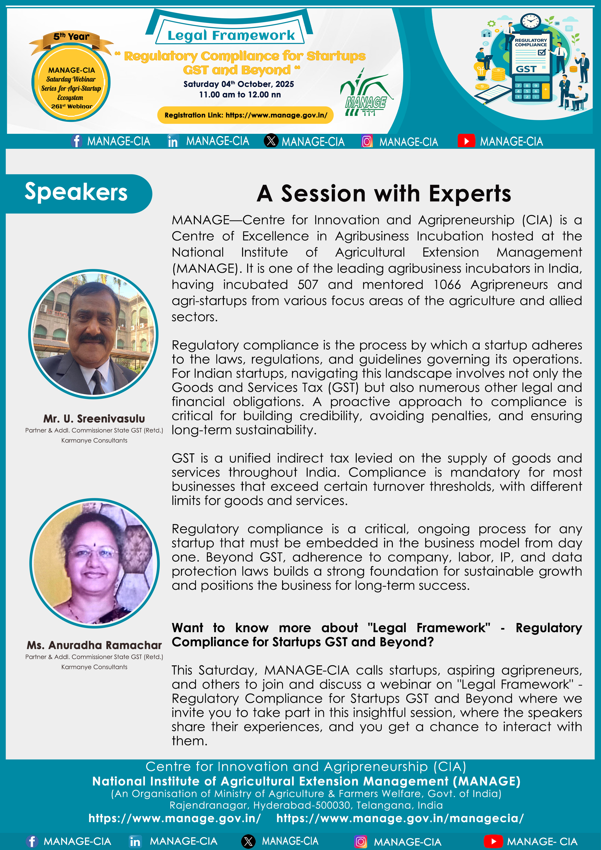 National Institute of Agricultural Extension Management (MANAGE) - Centre for Innovation and Agripreneurship (CIA), has launched “Saturday Webinar Series” to address various important topics relevant to Agri-Startup Eco-System and to create awareness among the Agri-Startups, Agri Entrepreneurs, Faculties, Scholars and Students, across India. Webinars are being conducted every Saturday 11 AM – 1 PM IST.