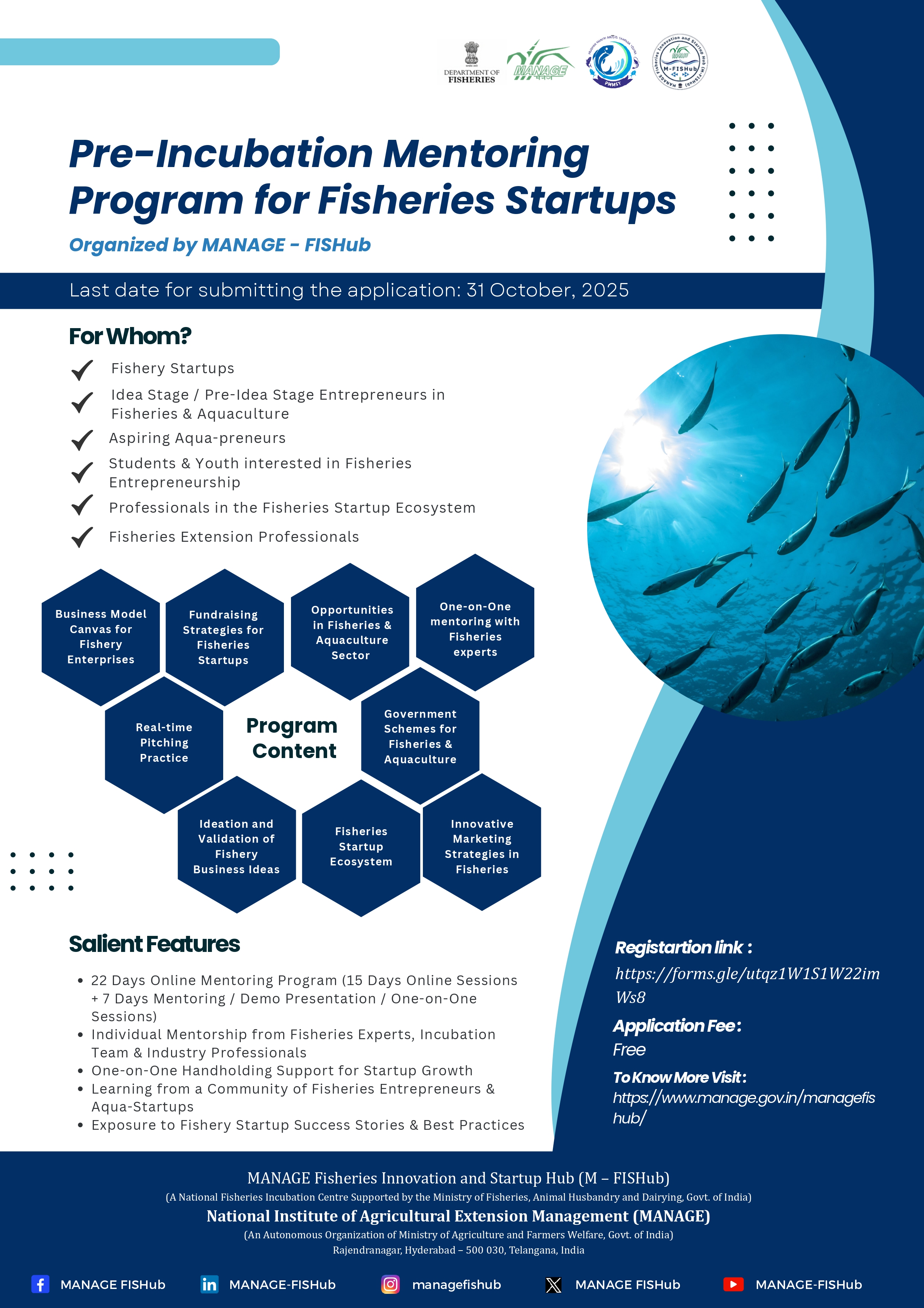 MANAGE-FISHub Incubation Program 2025 - Deadline : 15th November 2025 Brochure | Poster | Register | M-FISHub Incubation PPT Template